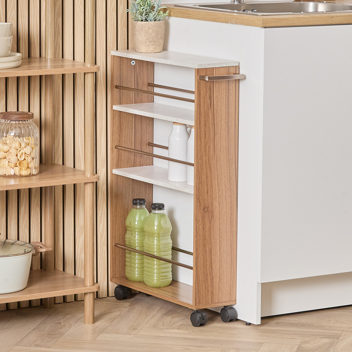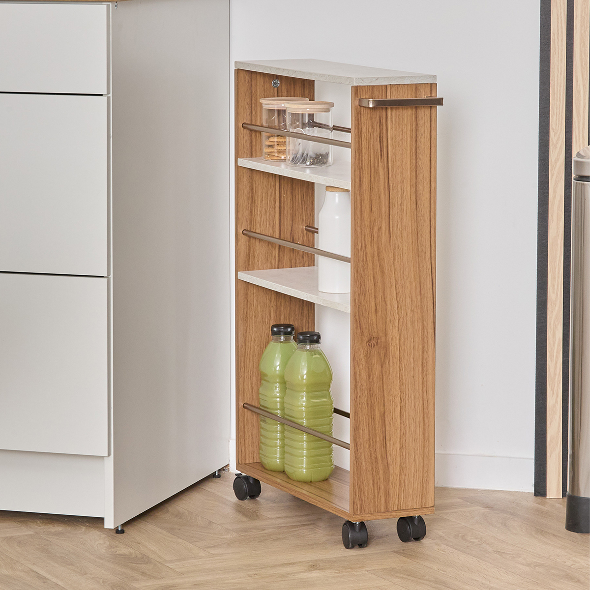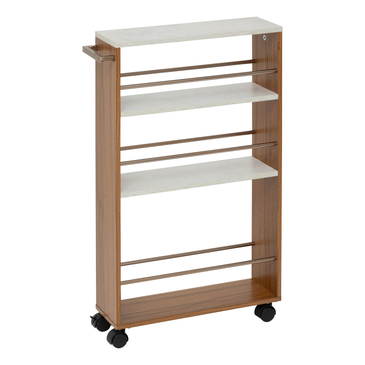 Τρόλεϊ - ραφιέρα με 4 ορόφους κατασκευασμένο από MDF σε καφέ απόχρωση με μεταλλικές λεπτομέρειες. Τα 2 ροδάκια διαθέτουν διακόπτη στοπ. Μπορεί να χρησιμοποιηθεί σαν βοηθητικό έπιπλο κουζίνας για οργάνωση τροφίμων ή άλλων χρηστικών ειδών, στο μπάνιο για τις πετσέτες, τα σαμπουάν κλπ.