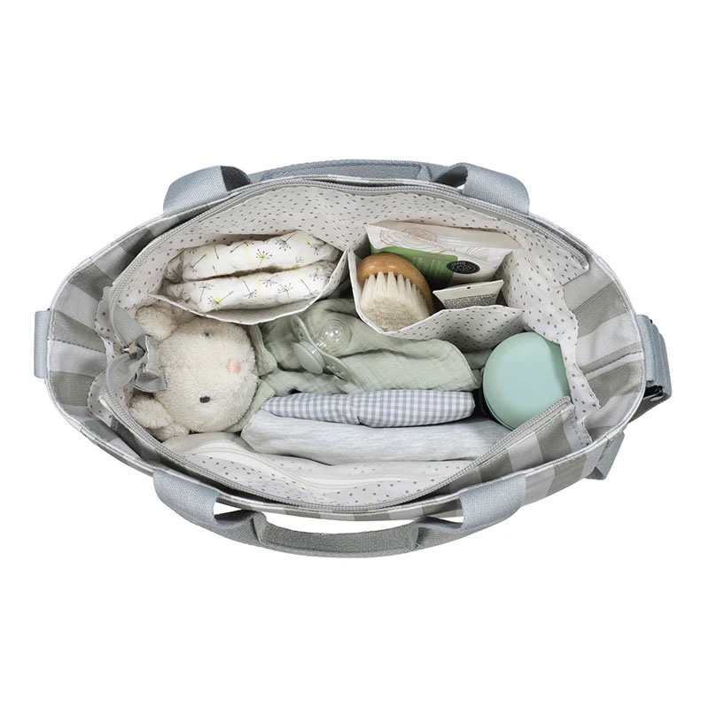 Τσάντα αλλαγής για το μωρό από την εταιρεία Walking Mum. Έχει γκρι χρώμα, με χακί λεπτομέρειες και ριγέ σχέδιο. Είναι κατασκευασμένη από 100% πλαστικοποιημένο βαμβάκι που έχει υποστεί ειδική επεξεργασία ώστε να είναι αδιάβροχο. Η Walking Mum προστατεύει το μωρό σας χρησιμοποιώντας τα καλύτερα υφάσματα, απαλλαγμένα από ζαχαρώματα και ουσίες που είναι επιβλαβείς για την υγεία. Αποτελείται από μία κύρια θήκη με πολλές θέσεις αποθήκευσης και κλείνει με φερμουάρ. Μέσα σε αυτή υπάρχουν επιμέρους τσέπες για μικροαντικείμενα. Το σακίδιο συνοδεύεται από ένα στρωματάκι αλλαξιέρα. Διαθέτει ρυθμιζόμενο ιμάντα ώμου για ευκολία. Επίσης έχει 2 κοντές λαβές που διευκολύνουν την τοποθέτηση σε οποιοδήποτε μοντέλο καροτσιού.