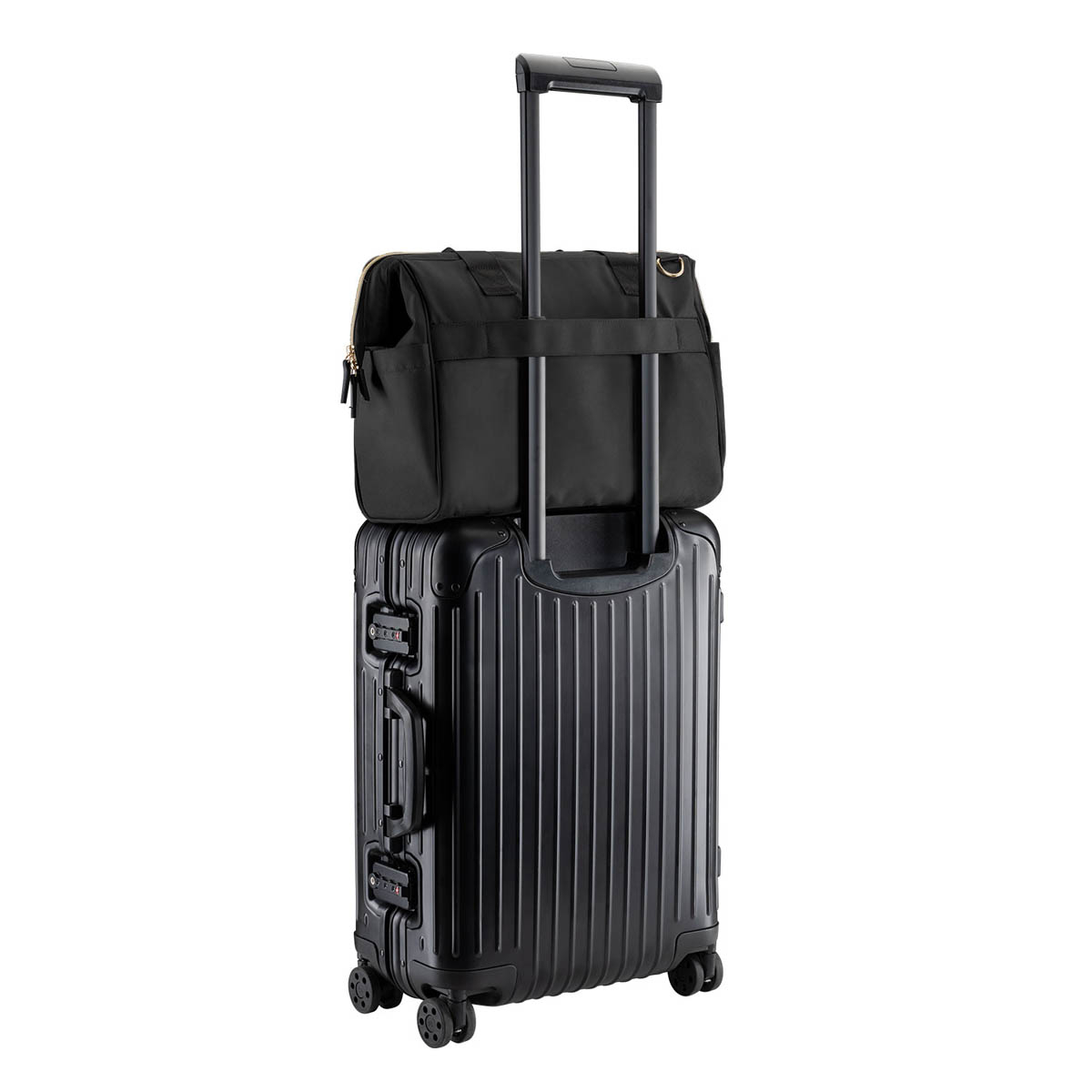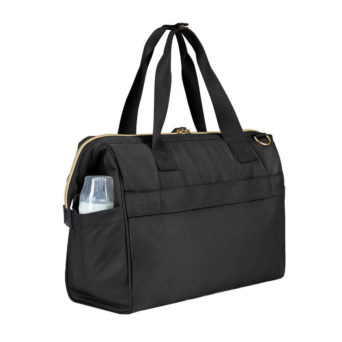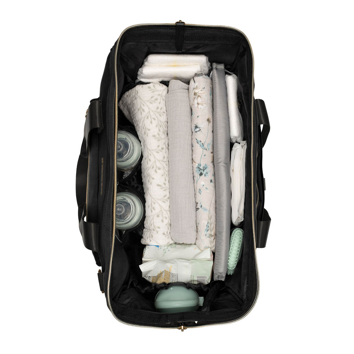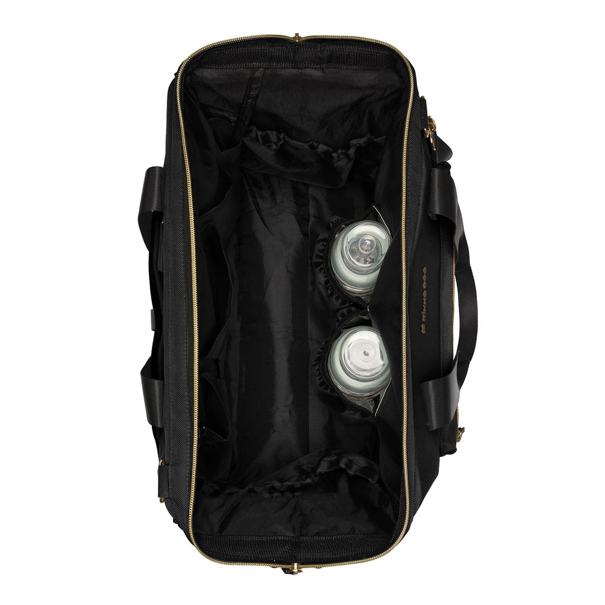 Τσάντα αλλαγής πάνας σε μαύρο χρώμα από την εταιρεία Kikka Boo. Είναι κατασκευασμένη από ύφασμα υψηλής ποιότητας, με σύνθεση 100% polyester που καθαρίζεται εύκολα με υγρό πανάκι. Εσωτερικά διαθέτει τσέπες για πάνε και ρούχα, 2 θερμομονωτικές θήκες για μπιμπερό και αδιάβροχη τσέπη για βρεγμένα ρούχα. Εξωτερικά διαθέτει 1 μεγάλη τσέπη με φερμουάρ 2 στα πλαϊνά και 1 στο πίσω μέρος. Περιλαμβάνει μαλακό στρωματάκι αλλαξιέρα για να αλλάζετε οπουδήποτε την πάνα του μωρού σας και ειδικούς ιμάντες για να την κρεμάτε στο καρότσι. Ο ιμάντας στο πίσω μέρος βοηθά στην εύκολη σύνδεση της τσάντας στο χερούλι της βαλίτσας σας. Με αφαιρούμενο πορτοφολάκι για εύκολη πρόσβαση στα χρήματά σας. Πρακτική και άνετη, θα γίνει το απαραίτητο αξεσουάρ σε κάθε έξοδό σας με το παιδί.