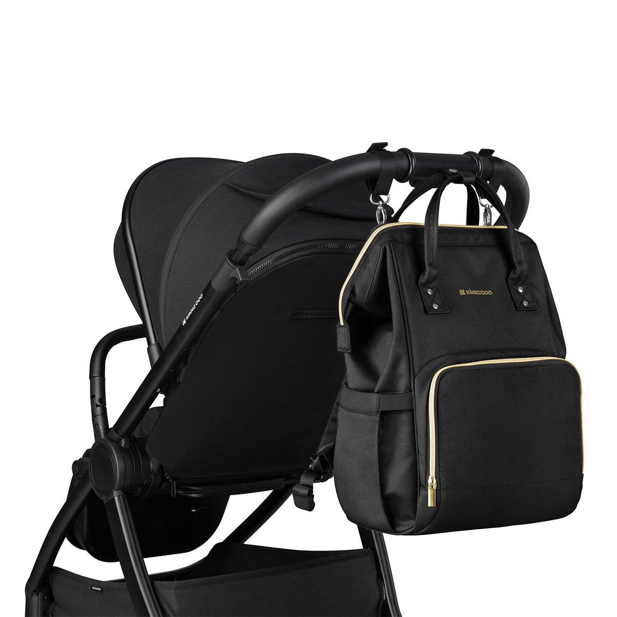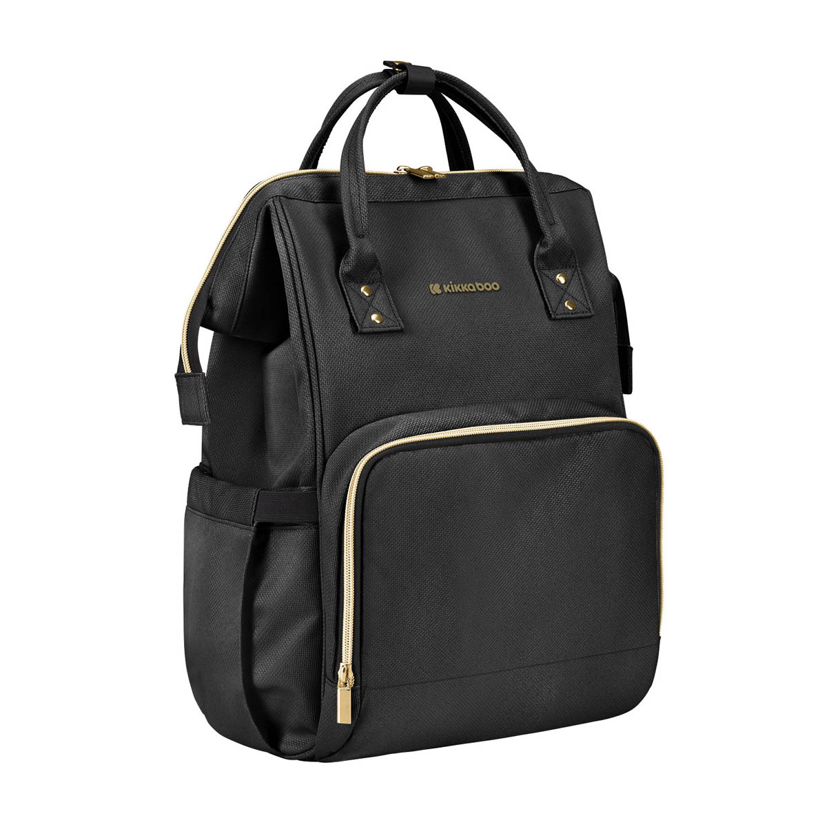 Τσάντα αλλαγής πάνας της εταιρείας Kikka Boo. Είναι κατασκευασμένη από 100% polyester ύφασμα σε μαύρο χρώμα με χρυσές λεπτομέρειες. Εσωτερικά έχει τσέπες για να τοποθετήσετε τις πάνες, τα ρούχα ή ότι άλλο χρειάζεστε μαζί σας και αδιάβροχη θήκη για να τοποθετείτε μέσα βρεγμένα ρούχα. Διαθέτει 3 θερμομονωτικές θέσεις για μπουκάλια που διατηρούν την θερμοκρασία του περιεχομένου για πολλές ώρες. Με 2 ευρύχωρες πλαϊνές τσέπες εξωτερικά και κλιπ για να τοποθετήσετε τα κλειδιά σας. Στο πίσω μέρος έχει θήκη που κλείνει με φερμουάρ και σας προσφέρει πρόσβαση στο κάτω μέρος του εσωτερικού της. Μπορείτε να την κρεμάσετε στο καρότσι με τα κλιπ που έχει, να την βάλετε στην πλάτη με τα μαλακά και άνετα ρυθμιζόμενα λουριά ώμου ή να την κρατήσετε από τις άνετες χειρολαβές της. Περιλαμβάνεται στρωματάκι αλλαγής.