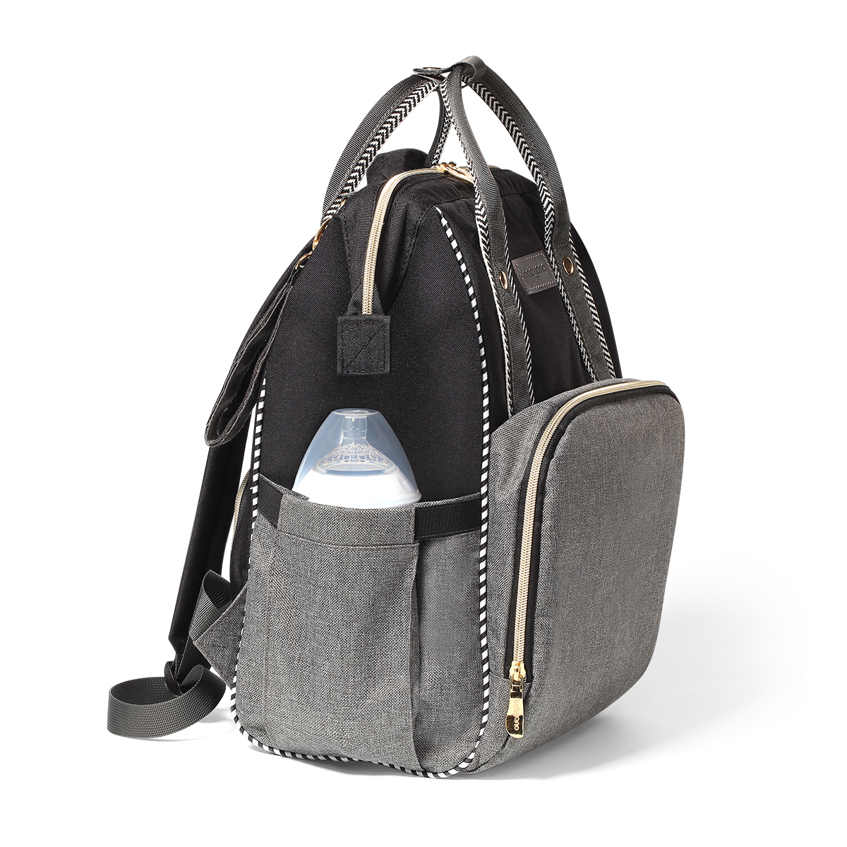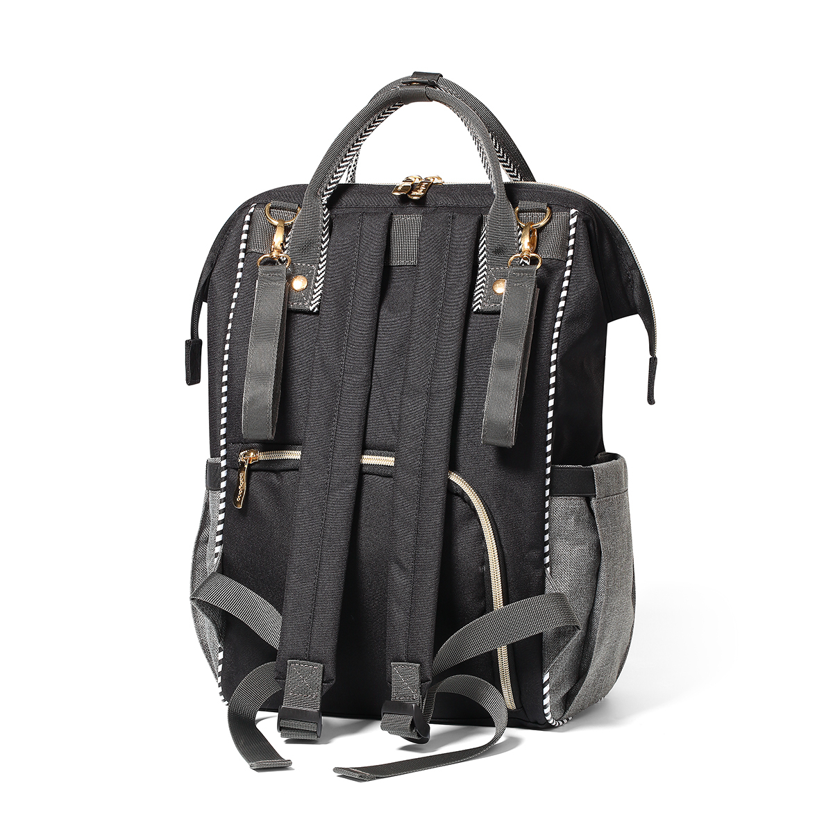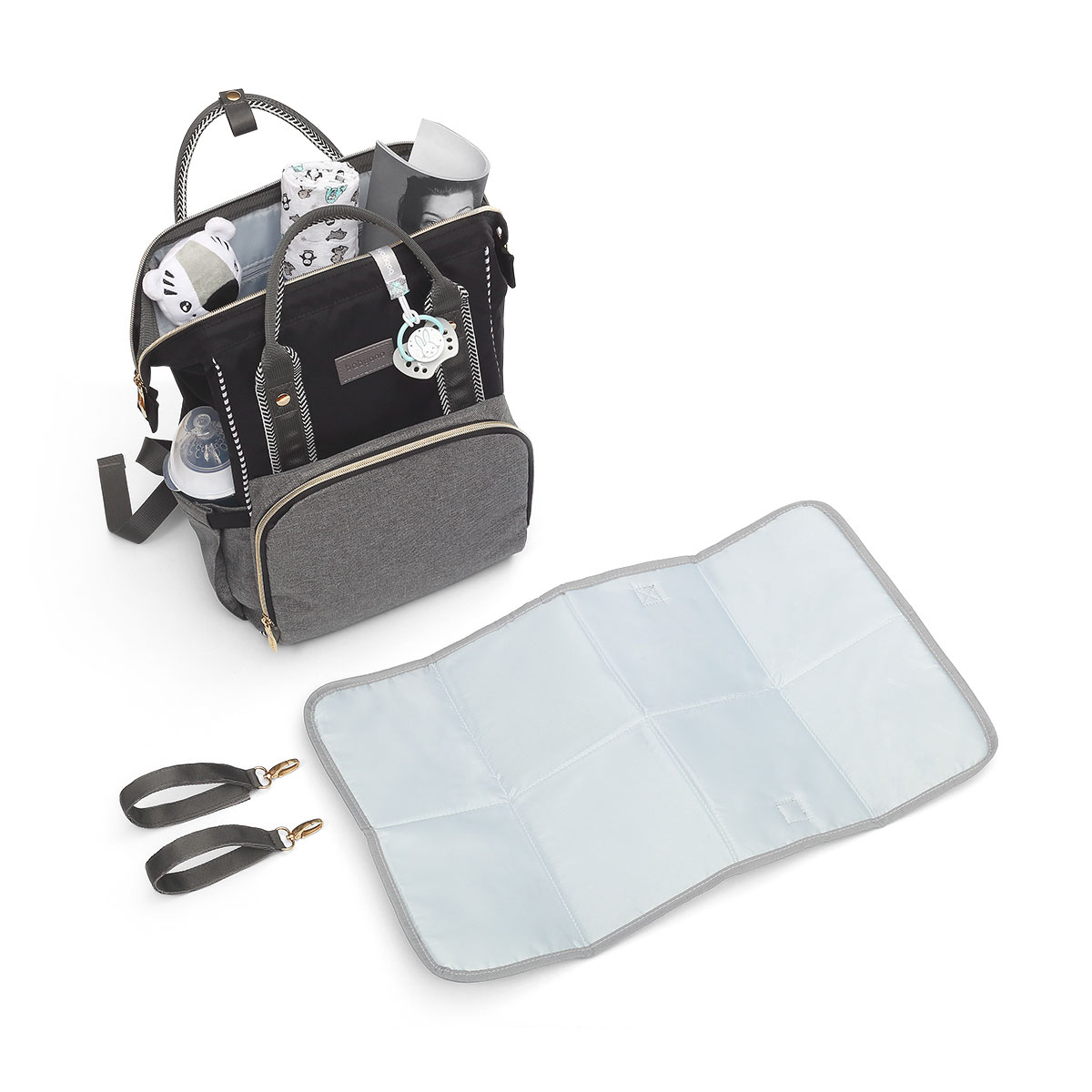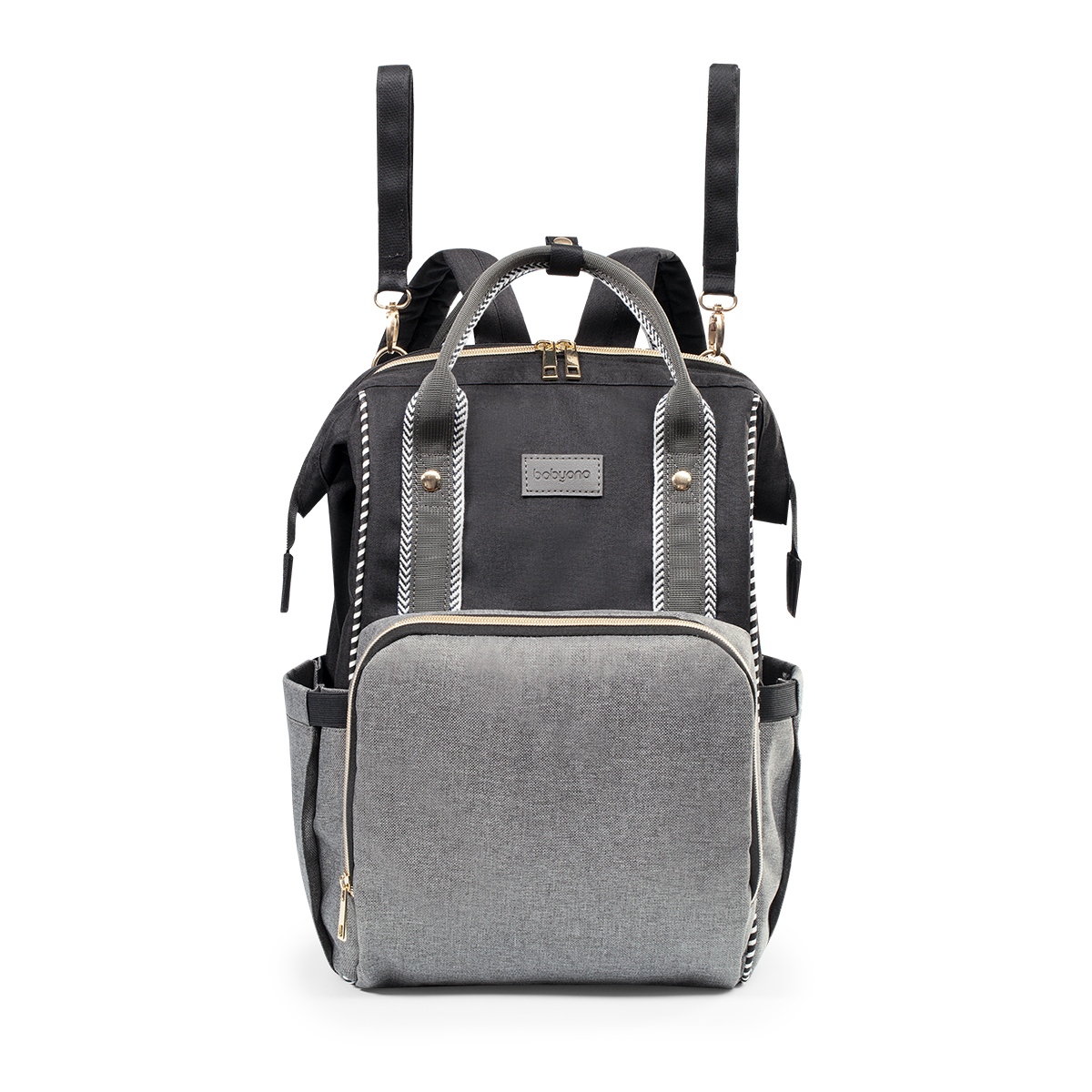Είναι η πιο τέλεια τσάντα για τη μαμά! Χωράει τα πάντα, έχει μοναδικό στύλ και δεν είναι μόνο για το μωρό! Πρακτικό σακίδιο σε γκρι-μαύρο χρώμα με 12 ξεχωριστές θήκες για να οργανώσετε άνετα όλα τα πράγματα του μωρού! Διαθέτει ειδική θερμομονωτική θήκη με εύκολη πρόσβαση για να μπορείτε να διατηρήσετε στην επιθυμητή θερμοκρασία το φαγητό του μωρού σας. Έχει μία θήκη κατάλληλη για βρεγμένα ρούχα και θήκες γρήγορης πρόσβασης για την πίπιλα, τα κλειδιά, το κινητό, κλπ. Μπορεί να τοποθετηθεί στην πλάτη με τα μαλακά και άνετα ρυθμιζόμενα λουριά ώμου ή να κρεμαστεί στο καροτσάκι του μωρού με τους κοντούς πλευρικούς ιμάντες. Είναι κατασκευασμένο από πολυεστερικο υλικό με ενισχυμένα στοιχεία που εγγυάται ανθεκτικότητα στις διαφορετικές συνθήκες χρήσης. Καθαρίζεται εύκολα. Περιλαμβάνεται στρωματάκι αλλαγής.