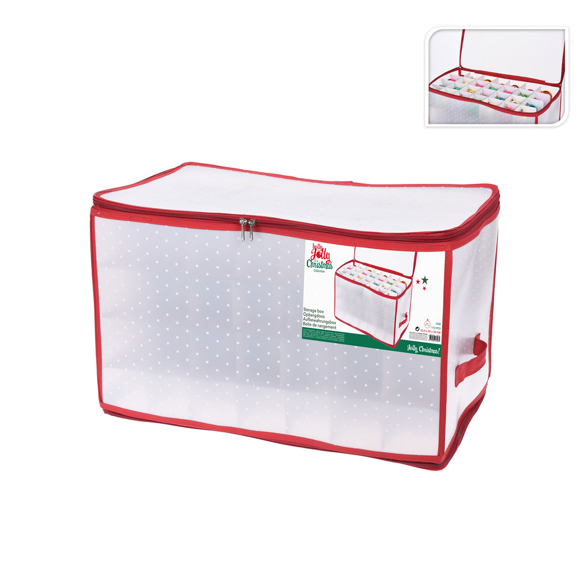 Τσάντα αποθήκευσης σε ημιδιαφανές λευκό χρώμα και κατασκευασμένη από ανθεκτικό PVC υλικό, ιδανικό για προστασία από σκόνη και υγρασία. Διαθέτει χωρίσματα από χαρτόνι που χωρούν μπάλες με μέγιστη διάμετρο 8εκ. Διαθέτει 4 επίπεδα χωρητικότητας 28 μπάλες το καθένα με συνολική χωρητικότητα 112 στολίδια. Κλείνει με φερμουάρ και έχει λαβές στα πλάγια για να την μεταφέρετε εύκολα. Δώστε τέλος στο χάος της αποθήκευσης και διατηρήστε τα στολίδια σας σαν καινούρια κάθε χρόνο.