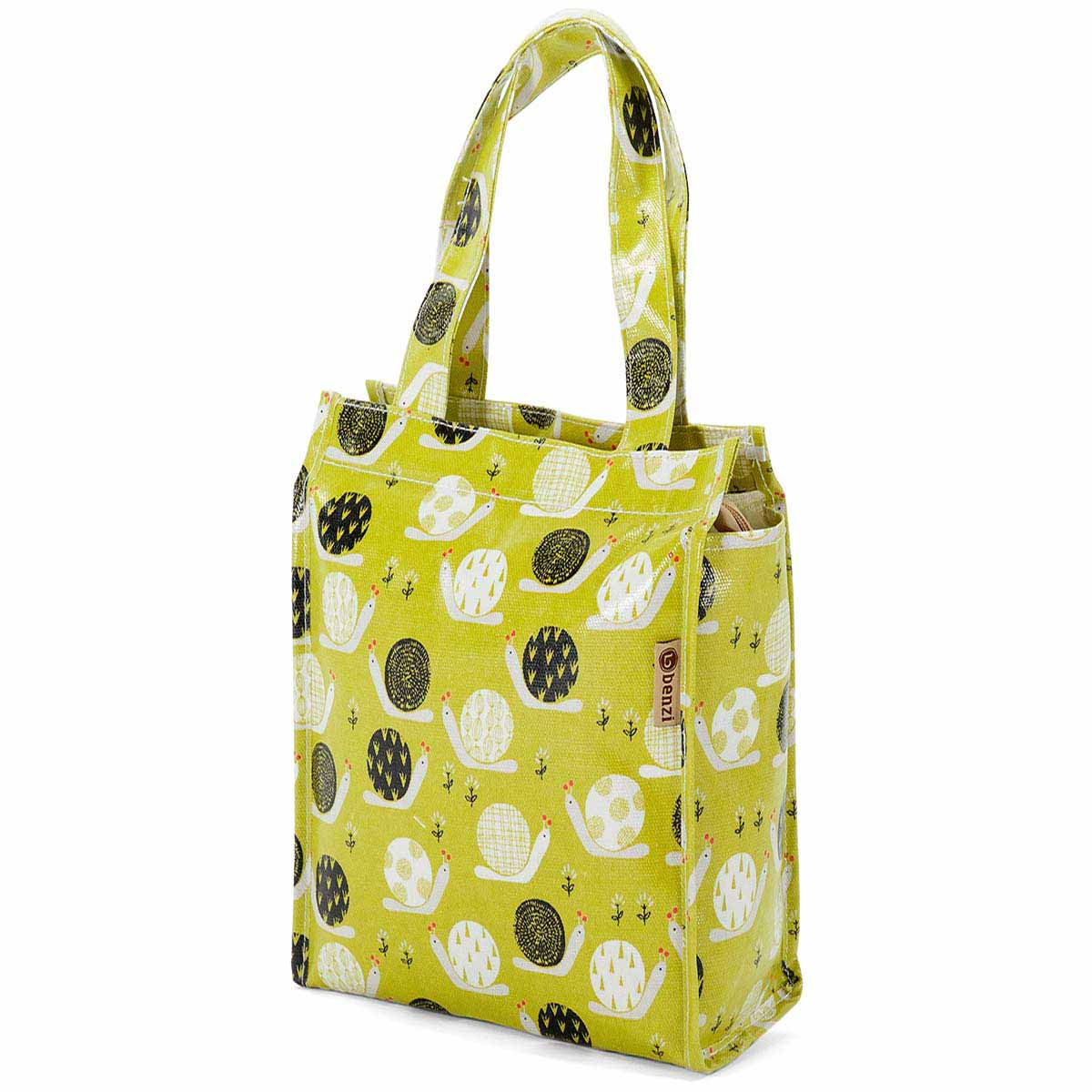 Τσάντα από την εταιρεία Benzi ιδανική για ψώνια ή οποιαδήποτε άλλη χρήση. Είναι αδιάβροχη, κατασκευασμένη από PVC με πράσινο φόντο και σχέδιο σαλιγκαριών. Κλείνει με φερμουάρ και διαθέτει μεγάλα χερούλια για πρακτικότητα.