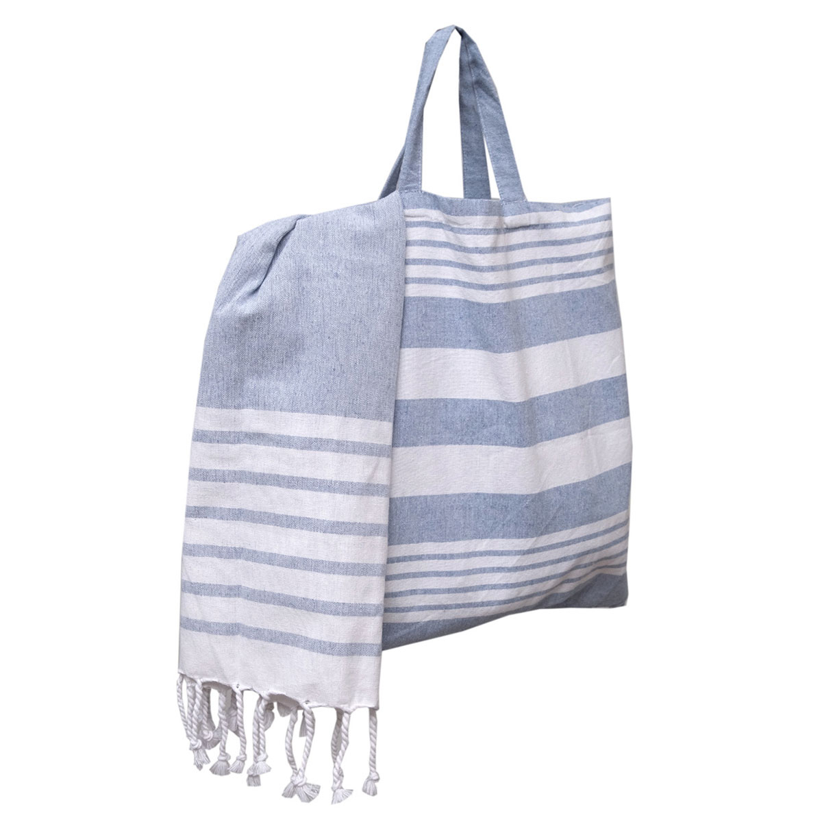 Τσάντα και παρεό από την εταιρεία Viopros. Είναι κατασκευασμένα από 100% βαμβάκι με ριγέ σχέδιο σε μπλε-λευκό χρώμα. Το παρεό έχει διακοσμητικά κρόσια ενώ η τσάντα θαλάσσης έχει πρακτικά χερούλια για εύκολη μεταφορά. Ιδανικό σετ για την παραλία.