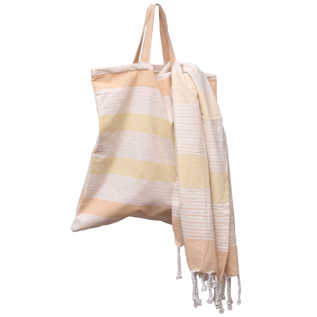 Τσάντα και παρεό από την εταιρεία Viopros. Είναι κατασκευασμένα από 100% βαμβάκι σε μπεζ αποχρώσεις με εκρού-κίτρινες λεπτομέρειες και ριγέ σχέδιο. Το παρεό έχει διακοσμητικά κρόσια ενώ η τσάντα θαλάσσης έχει πρακτικά χερούλια για εύκολη μεταφορά. Ιδανικό σετ για την παραλία.