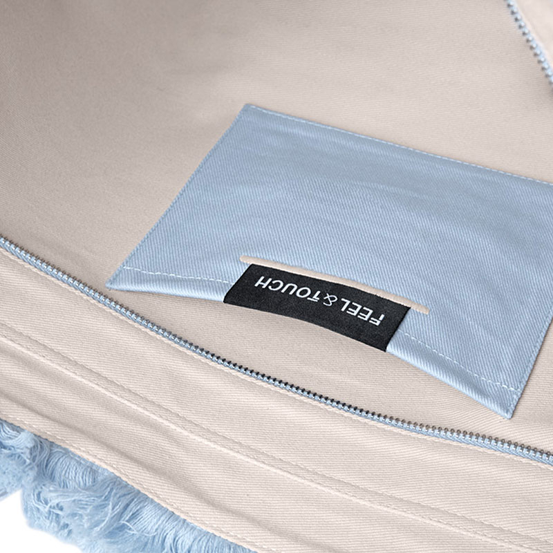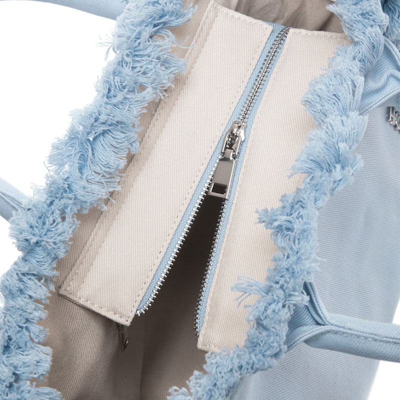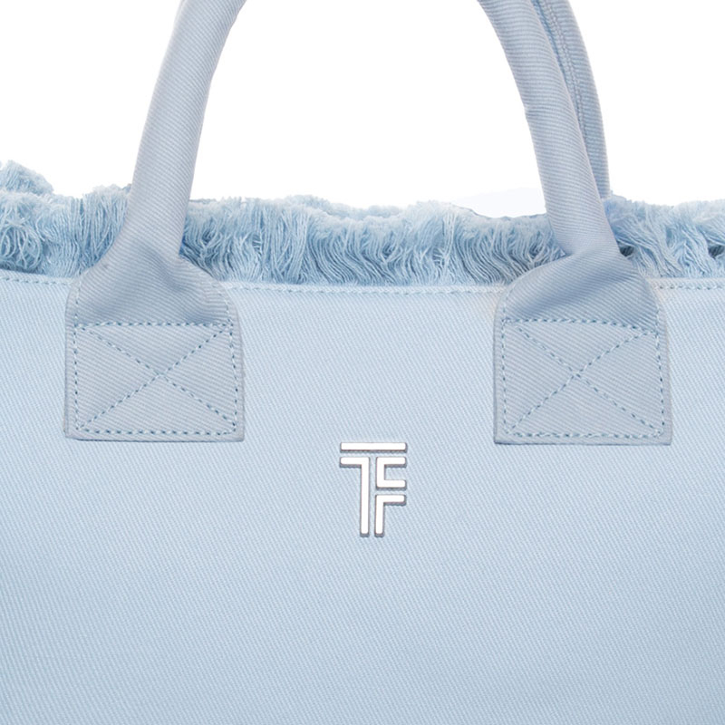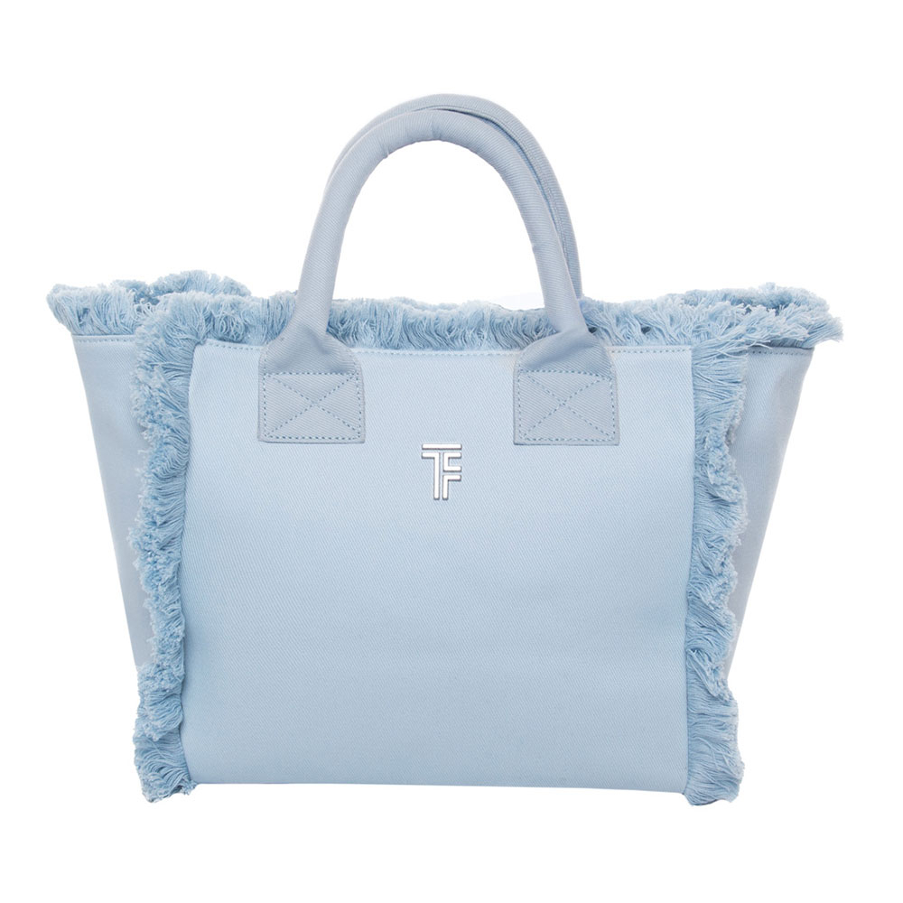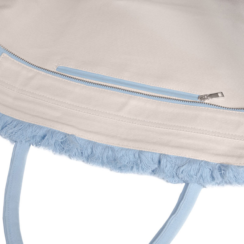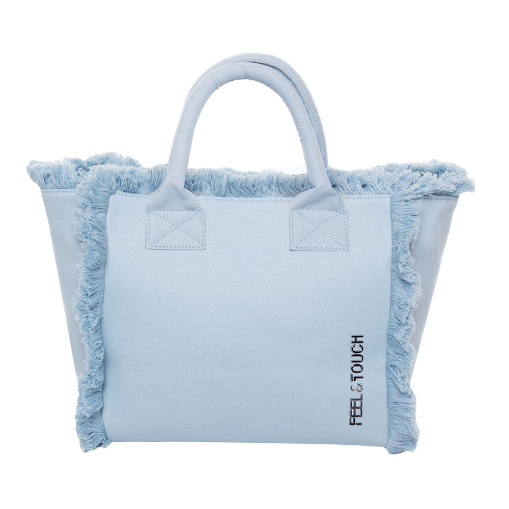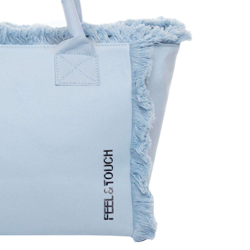 Τσάντα θαλάσσης από την εταιρεία Feel & Touch σε γαλάζιο χρώμα με διακοσμητικά κρόσια. Είναι κατασκευασμένη από 100% Αιγυπτιακό βαμβάκι που την καθιστά ιδιαίτερα μαλακή και ανθεκτική. Διαθέτει χερούλια για να μπορείτε να την κρατάτε. Κλείνει με φερμουάρ. Διαθέτει άφθονο χώρο και θήκες για να τακτοποιείτε τα μικροπράγματά σας. Συνδυάστε την με τα υπόλοιπα είδη της ίδιας σειράς για ένα ολοκληρωμένο σετ.