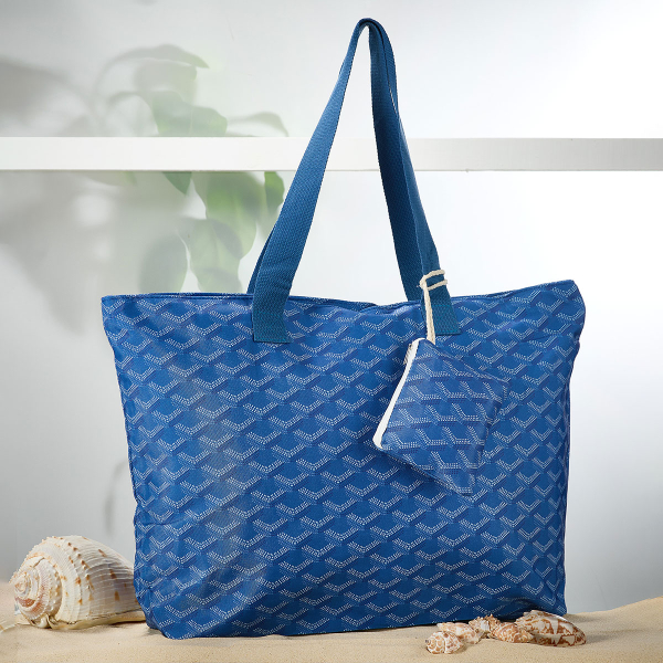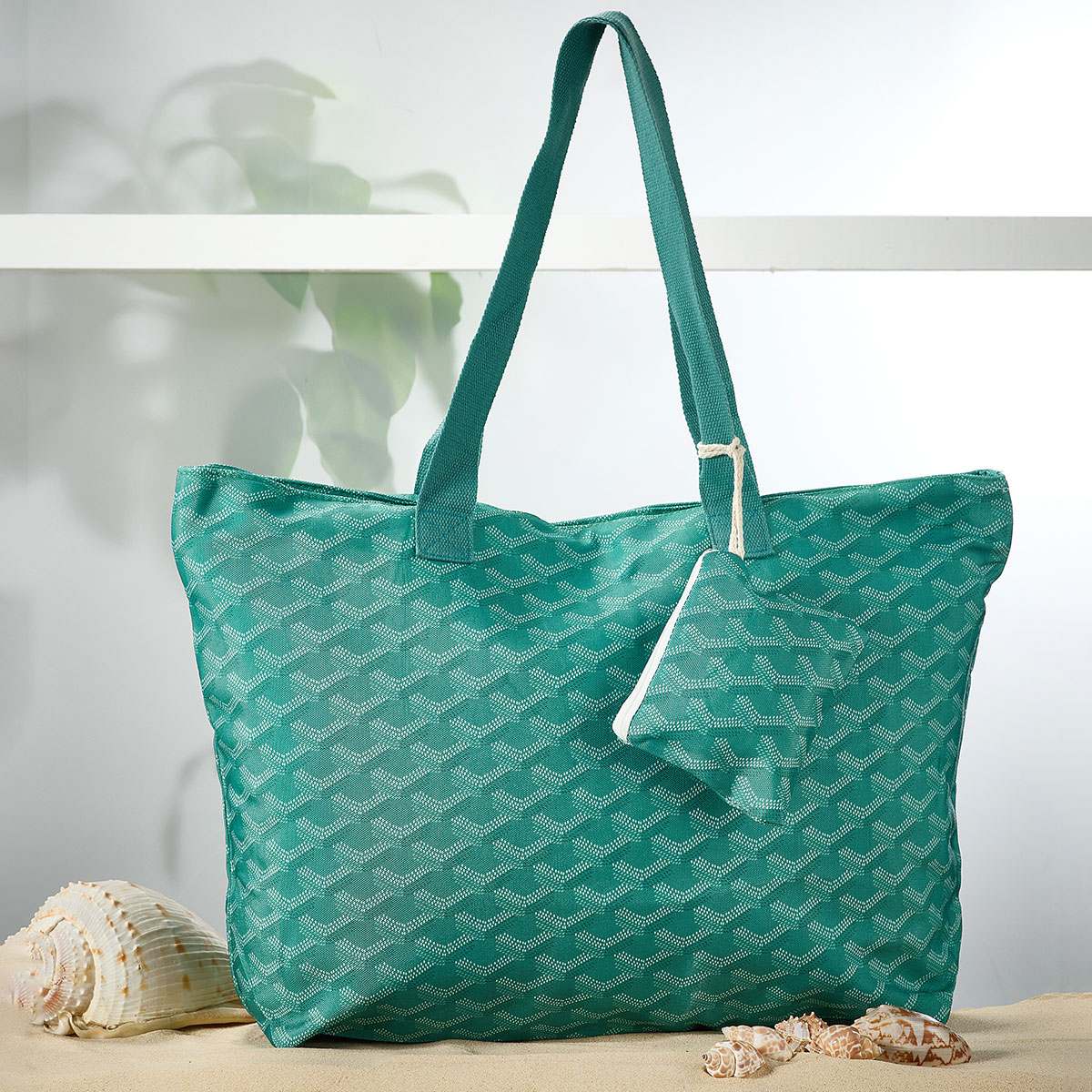 Τσάντα παραλίας από την εταιρεία Whitegg σε πράσινο χρώμα με γεωμετρικό σχέδιο. Είναι κατασκευασμένη από 100% πολυεστέρα. Διαθέτει χερούλια για να την κρεμάτε στον ώμο σας. Επίσης, έχει ένα αποσπώμενο πορτοφολάκι με το ίδιο μοτίβο. Κλείνει με φερμουάρ για να έχετε πάντα προστατευμένα τα αντικείμενά σας. Ιδανική τσάντα για να μεταφέρετε την πετσέτα σας, τα αντηλιακά σας και ότι άλλο χρειάζεστε για την παραλία.