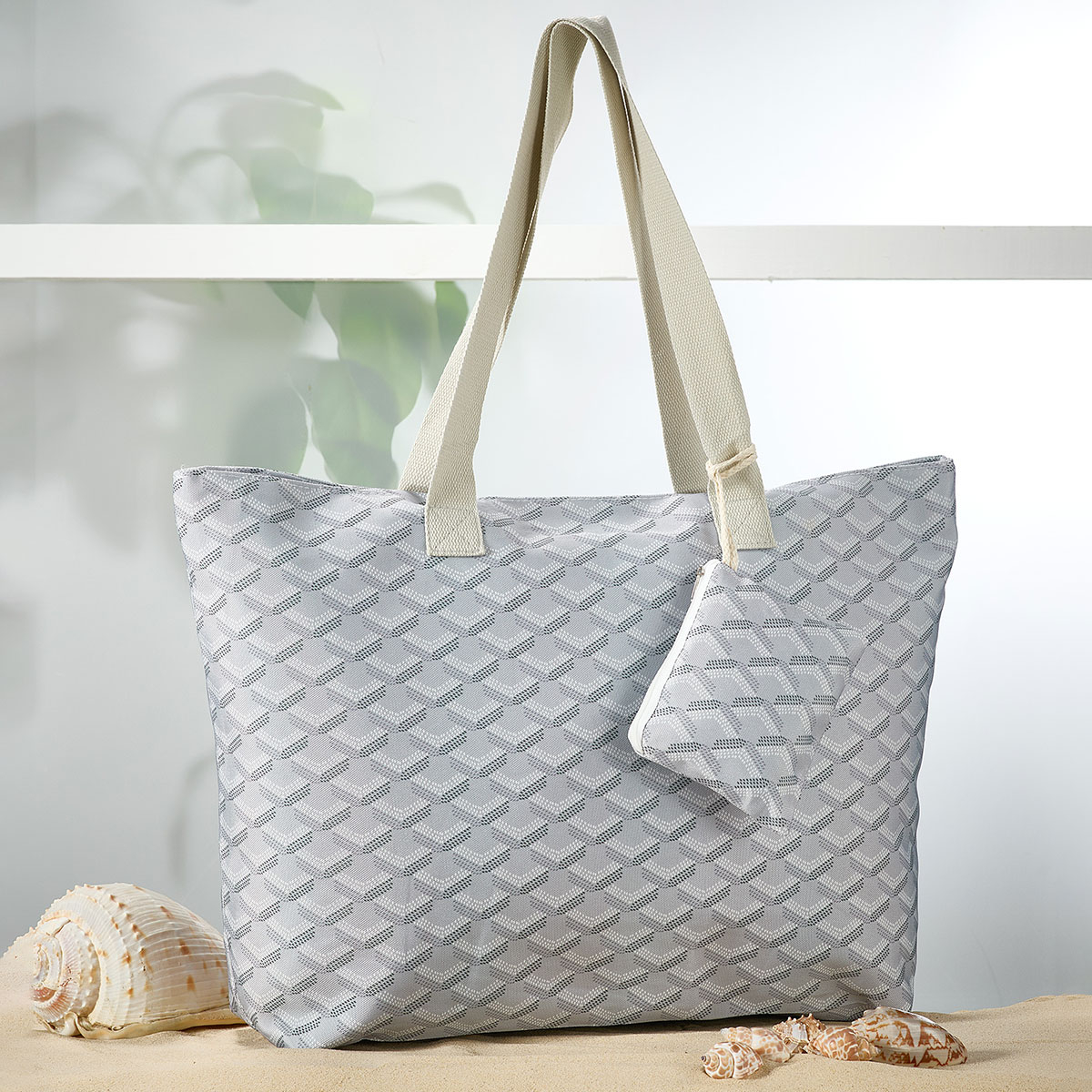 Τσάντα παραλίας από την εταιρεία Whitegg σε γκρι χρώμα με γεωμετρικό σχέδιο. Είναι κατασκευασμένη από 100% πολυεστέρα. Διαθέτει χερούλια για να την κρεμάτε στον ώμο σας. Επίσης, έχει ένα αποσπώμενο πορτοφολάκι με το ίδιο μοτίβο. Κλείνει με φερμουάρ για να έχετε πάντα προστατευμένα τα αντικείμενά σας. Ιδανική τσάντα για να μεταφέρετε την πετσέτα σας, τα αντηλιακά σας και ότι άλλο χρειάζεστε για την παραλία.