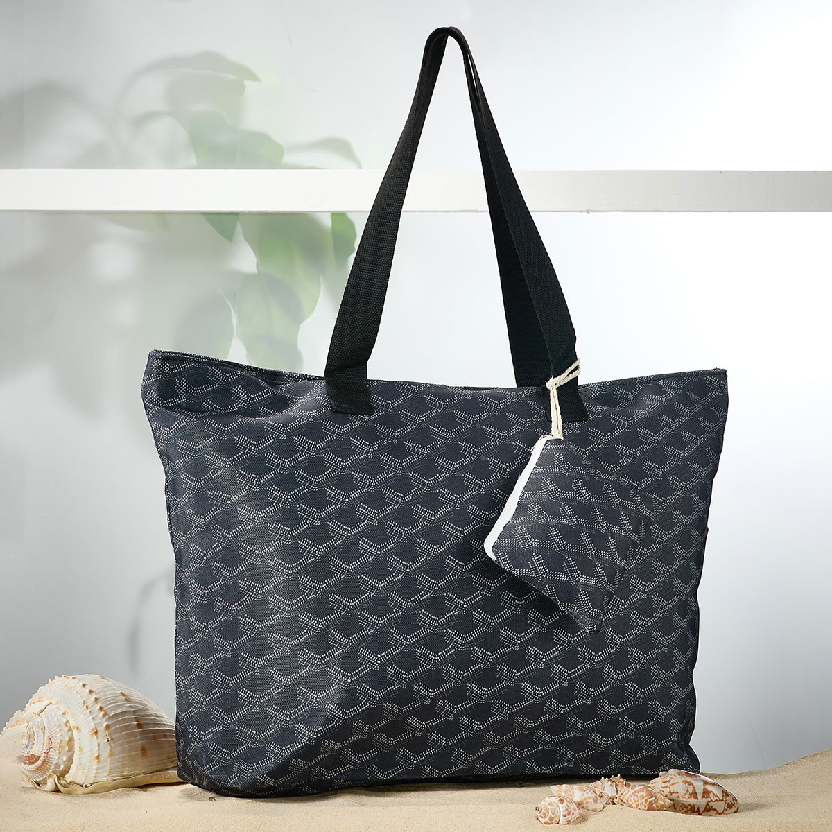 Τσάντα παραλίας από την εταιρεία Whitegg σε μαύρο χρώμα με γεωμετρικό σχέδιο. Είναι κατασκευασμένη από 100% πολυεστέρα. Διαθέτει χερούλια για να την κρεμάτε στον ώμο σας. Επίσης, έχει ένα αποσπώμενο πορτοφολάκι με το ίδιο μοτίβο. Κλείνει με φερμουάρ για να έχετε πάντα προστατευμένα τα αντικείμενά σας. Ιδανική τσάντα για να μεταφέρετε την πετσέτα σας, τα αντηλιακά σας και ότι άλλο χρειάζεστε για την παραλία.