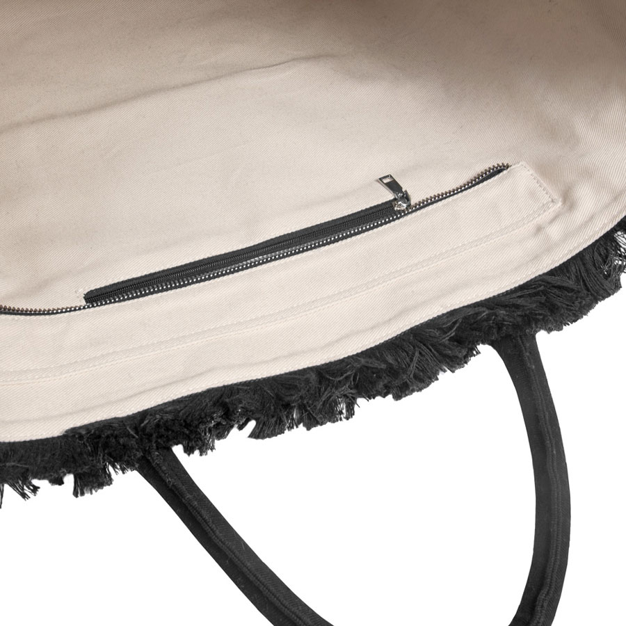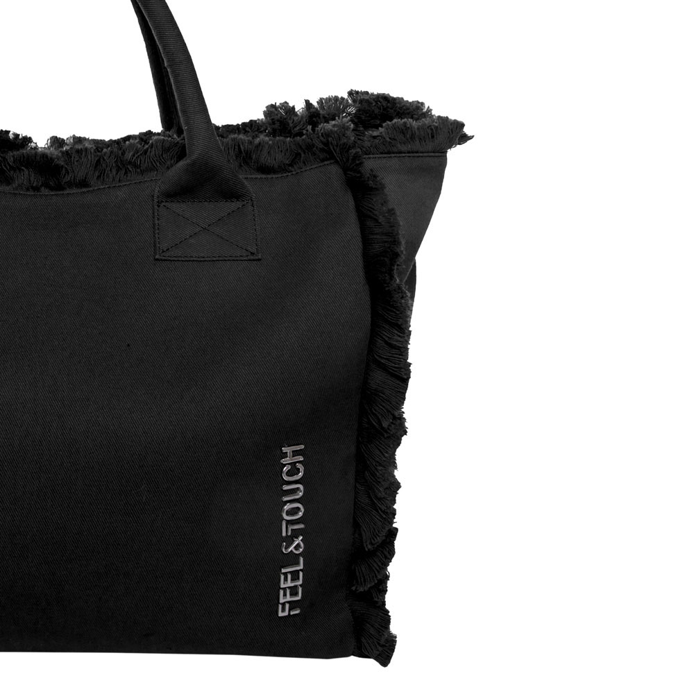 Τσάντα θαλάσσης μεγάλη από την εταιρεία Feel & Touch σε μαύρο χρώμα με διακοσμητικά κρόσια. Είναι κατασκευασμένη από 100% Αιγυπτιακό βαμβάκι που την καθιστά ιδιαίτερα μαλακή και ανθεκτική. Διαθέτει χερούλια για να μπορείτε να την κρατάτε ή να την κρεμάτε στον ώμο σας. Κλείνει με φερμουάρ. Διαθέτει άφθονο χώρο και θήκες για να τακτοποιείτε τα μικροπράγματά σας. Συνδυάστε την με τα υπόλοιπα είδη της ίδιας σειράς για ένα ολοκληρωμένο σετ.