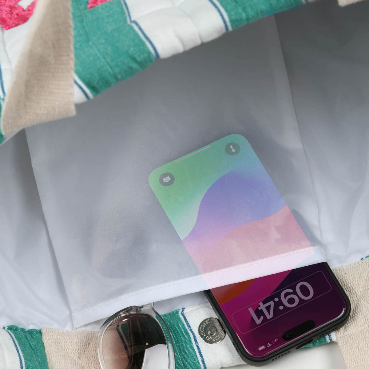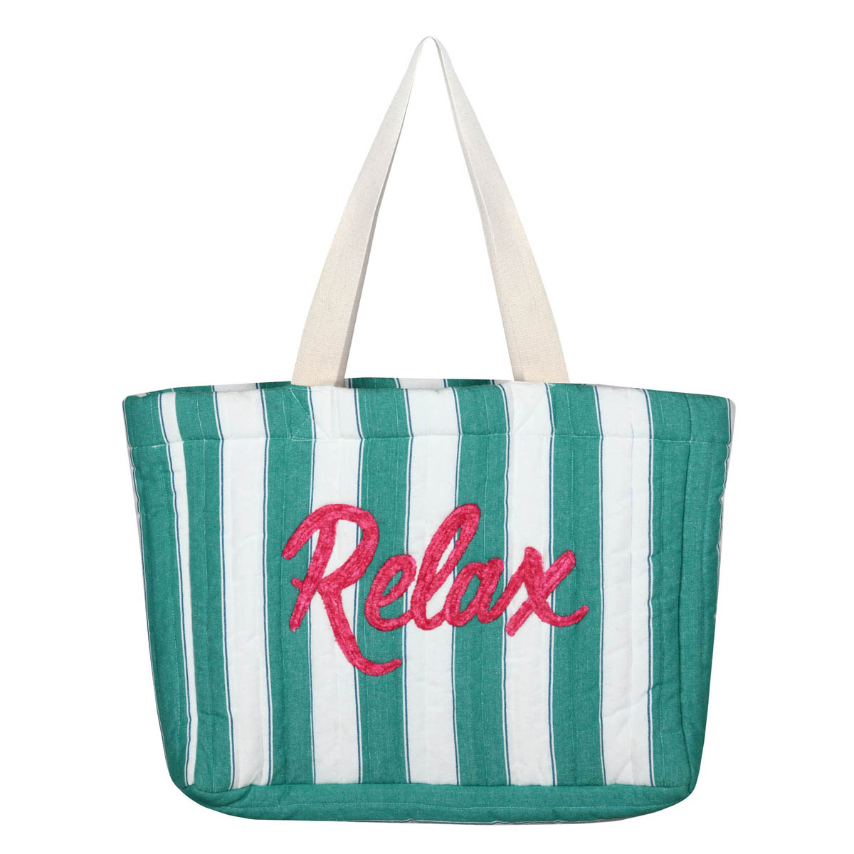 Τσάντα θαλάσσης με ριγέ σχέδιο σε πράσινο-λευκό χρώμα και ροζ λεπτομέρειες. Το εξωτερικό ύφασμα είναι 50% polyester-50 βαμβάκι και το εσωτερικό 100% polyester. Τα λουριά της είναι πλατιά και μαλακά για να μην προκαλούν πόνο και ερεθισμό στο δέρμα. Κλείνει με μαγνητικό κουμπί. Συνδυάστε το με τα υπόλοιπα είδη της σειράς για ένα ολοκληρωμένο αποτέλεσμα.