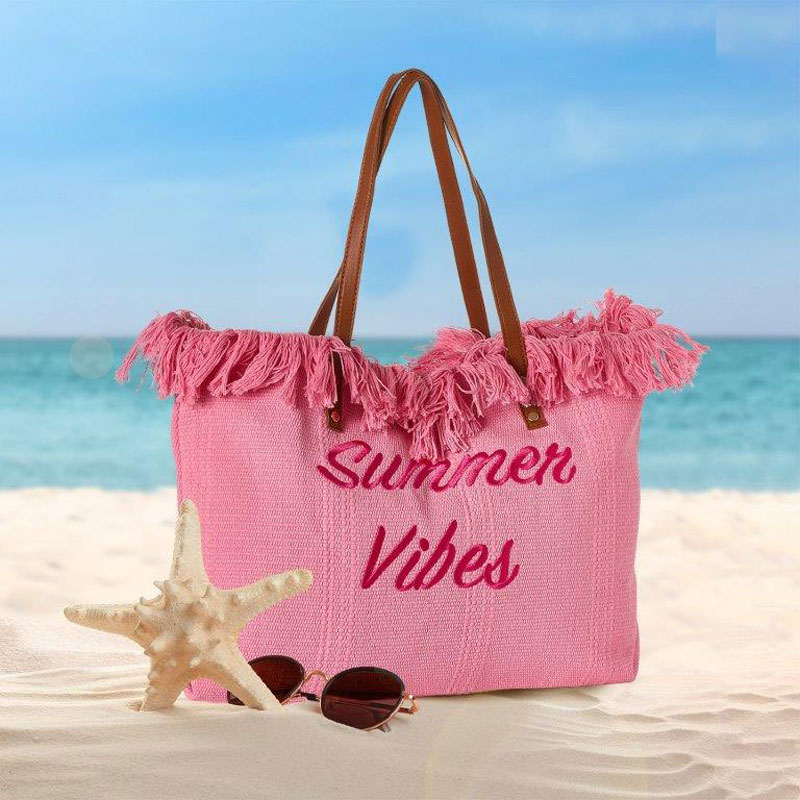 Τσάντα παραλίας σε φούξια χρώμα διακοσμητικά κρόσια και μοντέρνο σχέδιο από την εταιρεία Whitegg . Είναι κατασκευασμένη από 50% βαμβάκι 50% πολυεστέρα. Διαθέτει χερούλια από δερματίνη για να την κρεμάτε στον ώμο σας. Διαθέτει κλείσιμο με κουμπί. Ιδανική τσάντα για να μεταφέρετε την πετσέτα σας, τα αντηλιακά σας και ότι άλλο χρειάζεστε για την παραλία.