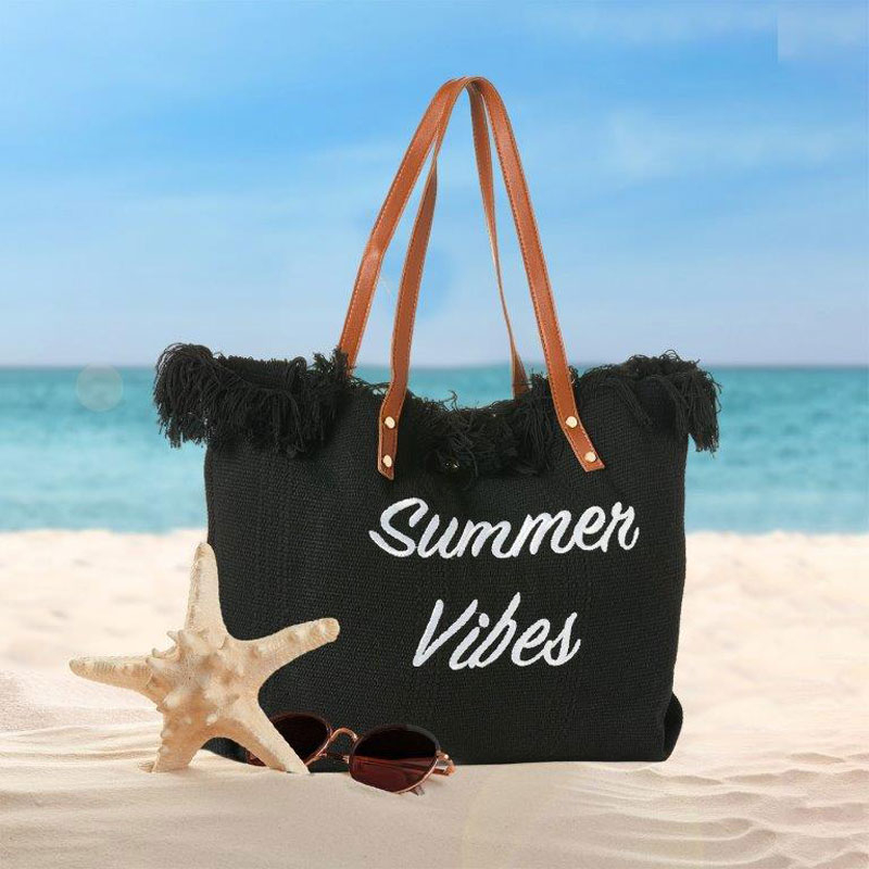Τσάντα παραλίας σε μαύρο χρώμα διακοσμητικά κρόσια και μοντέρνο σχέδιο από την εταιρεία Whitegg . Είναι κατασκευασμένη από 50% βαμβάκι 50% πολυεστέρα. Διαθέτει χερούλια από δερματίνη για να την κρεμάτε στον ώμο σας. Διαθέτει κλείσιμο με κουμπί. Ιδανική τσάντα για να μεταφέρετε την πετσέτα σας, τα αντηλιακά σας και ότι άλλο χρειάζεστε για την παραλία.