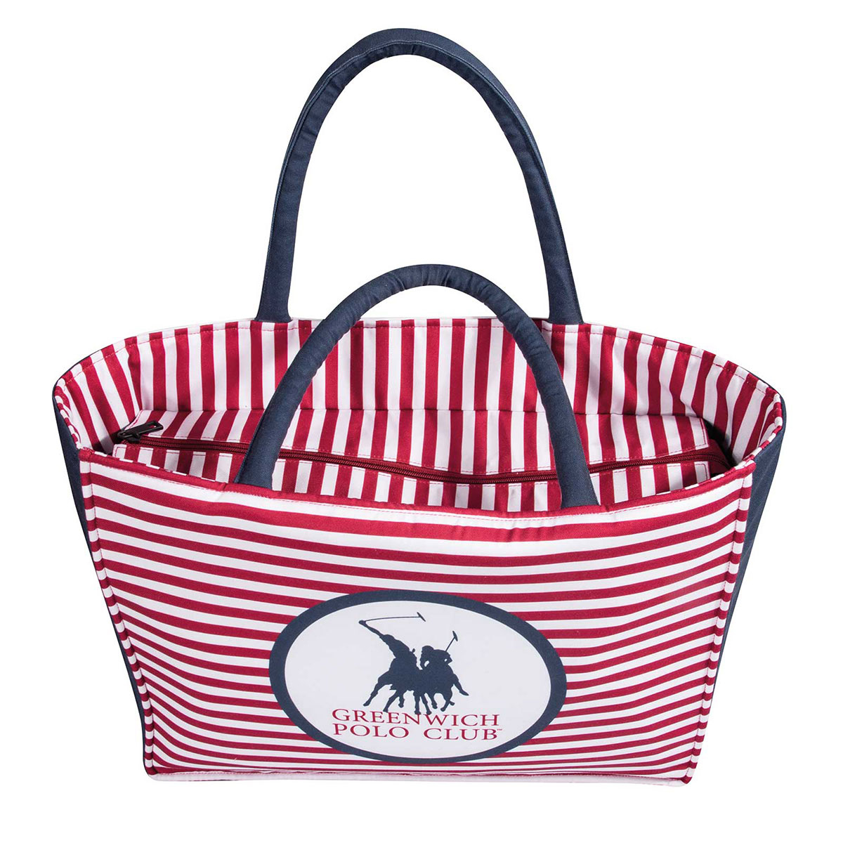Τσάντα θαλάσσης μεγάλη από τον οίκο Greenwich Polo Club που προσφέρει ποιότητα, στυλ και πολυτέλεια. Έχει κόκκινο χρώμα, με μπλε-λευκές λεπτομέρειες και ριγέ σχέδιο. Είναι κατασκευασμένη εσωτερικά και εξωτερικά από 100% polyester που την καθιστά ανθεκτική. Συνδυάστε την με τα υπόλοιπα είδη της ίδιας σειράς για ένα ολοκληρωμένο αποτέλεσμα. Δεν διαθέτει φερμουάρ.