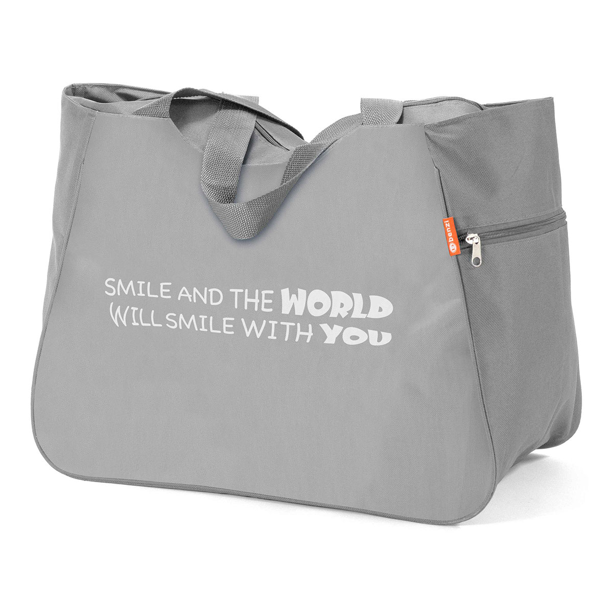 Τσάντα παραλίας από την εταιρεία Benzi σε γκρι χρώμα. Είναι κατασκευασμένη από 100% πολυεστέρα. Έχει μια μεγάλη θήκη με φόδρα που κλείνει με φερμουάρ. Διαθέτει πλαϊνή τσέπη ιδανική για να αποθηκεύσετε μικροαντικείμενα. Έχει δύο υφασμάτινα χερούλια για να την βάζετε στον ώμο σας. Ιδανική για τις εξορμήσεις στις παραλίες τους καλοκαιρινούς μήνες καθώς χωράει όλα τα απαραίτητα αντικείμενα σας.