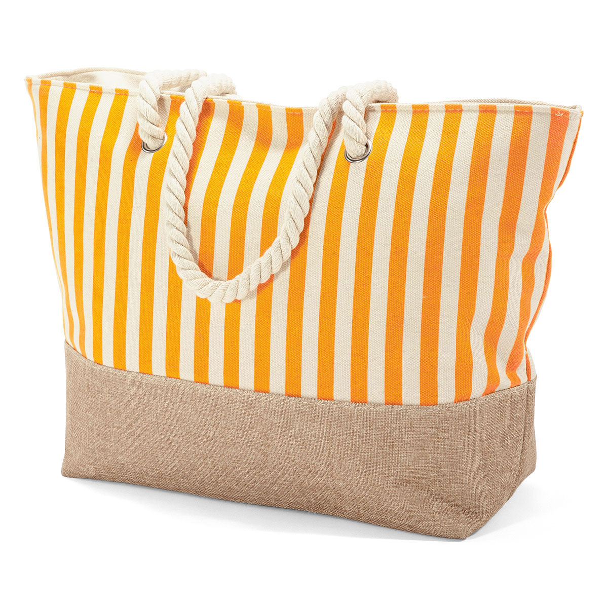 Τσάντα θαλάσσης μεγάλη με ριγέ σχέδιο σε εκρού-πορτοκαλί χρώμα με μπεζ λεπτομέρειες από την εταιρεία Benzi. Είναι κατασκευασμένη από ύφασμα καμβά με φόδρα εσωτερικά. Ιδανική για τις εξορμήσεις στις παραλίες τους καλοκαιρινούς μήνες και αρκετά μεγάλη για να μπορεί να χωρέσει όλα τα απαραίτητα αντικείμενα σας. Διαθέτει εσωτερικό τσεπάκι για έξτρα χώρο και κλείσιμο με φερμουάρ.