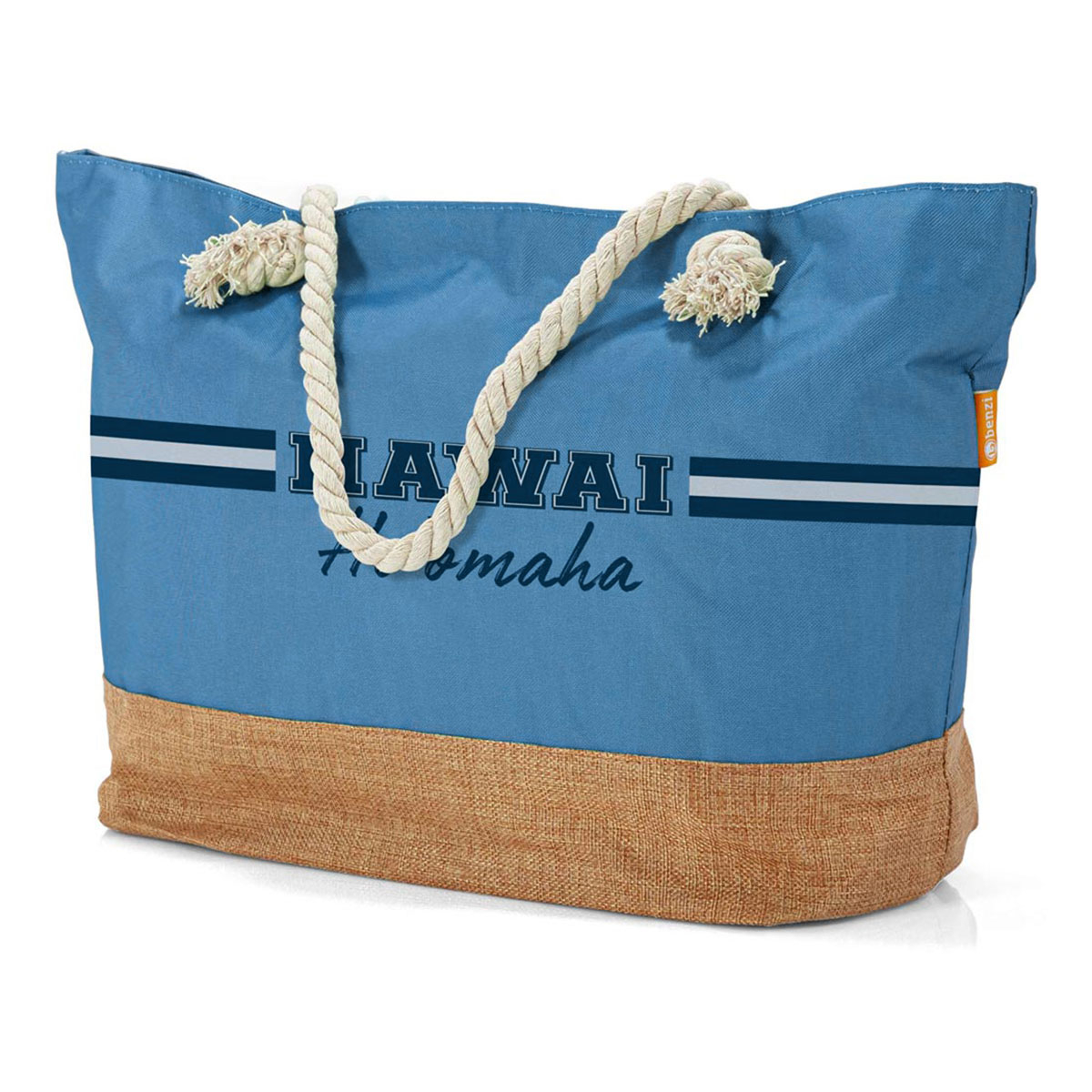 Τσάντα παραλίας από την εταιρεία Benzi σε μπλε χρώμα με μοντέρνο σχέδιο. Είναι κατασκευασμένη από πολυεστέρα. Έχει στοιχεία από ύφασμα καμβά σε φυσική απόχρωση. Αποτελείται από μια μεγάλη θήκη με φόδρα που κλείνει με φερμουάρ. Διαθέτει μία τσέπη στο εσωτερικό ιδανική για να αποθηκεύσετε μικροαντικείμενα καθώς κλείνει με φερμουάρ. Έχει δύο χερούλια από σχοινί για να την βάζετε στον ώμο σας. Ιδανική για τις εξορμήσεις στις παραλίες τους καλοκαιρινούς μήνες καθώς χωράει όλα τα απαραίτητα αντικείμενα σας.