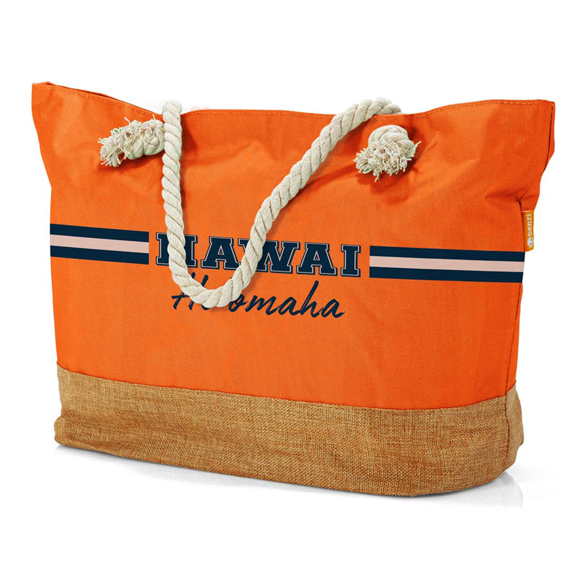 Τσάντα παραλίας από την εταιρεία Benzi σε πορτοκαλί χρώμα με μοντέρνο σχέδιο. Είναι κατασκευασμένη από πολυεστέρα. Έχει στοιχεία από ύφασμα καμβά σε φυσική απόχρωση. Αποτελείται από μια μεγάλη θήκη με φόδρα που κλείνει με φερμουάρ. Διαθέτει μία τσέπη στο εσωτερικό ιδανική για να αποθηκεύσετε μικροαντικείμενα καθώς κλείνει με φερμουάρ. Έχει δύο χερούλια από σχοινί για να την βάζετε στον ώμο σας. Ιδανική για τις εξορμήσεις στις παραλίες τους καλοκαιρινούς μήνες καθώς χωράει όλα τα απαραίτητα αντικείμενα σας.