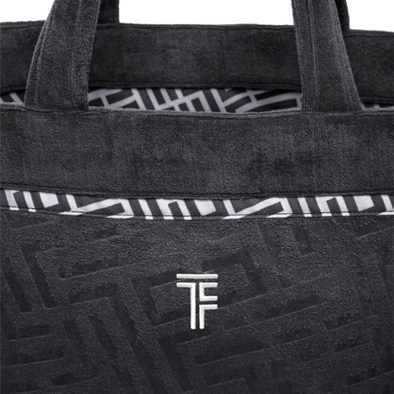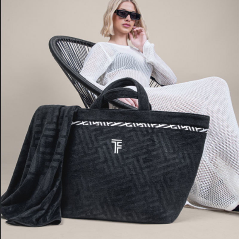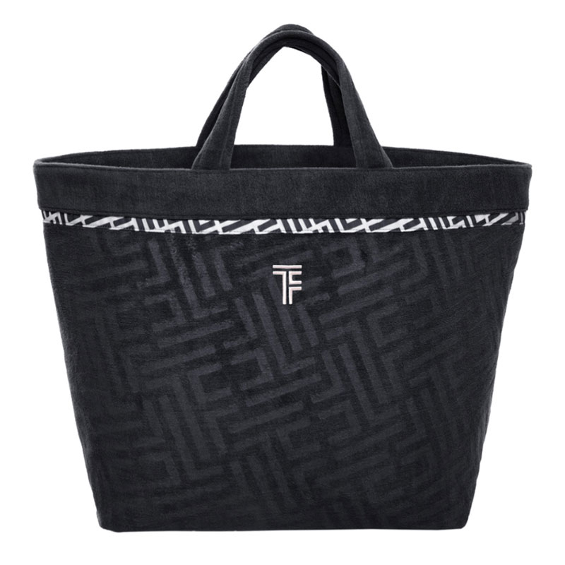 Τσάντα θαλάσσης μεγάλη από την εταιρεία Feel & Touch σε μαύρο χρώμα με λευκές λεπτομέρειες. Είναι κατασκευασμένη από πετσετέ ύφασμα με βελουτέ υφή και σύνθεση από 88% Polyester-12% πολυαμίδιο που την καθιστά μαλακή και ανθεκτική. Έχει χερούλια για να μπορείτε να την κρατάτε ή να την κρεμάτε στον ώμο σας. Διαθέτει άφθονο χώρο και 4 θήκες για τα πράγματά σας. Η εσωτερική επένδυση είναι από αδιάβροχο ύφασμα που προσφέρει επιπλέον προστασία από την υγρασία. Δεν διαθέτει φερμουάρ ή κουμπί για να κλείνει, προσφέροντας εύκολη πρόσβαση στα αντικείμενά σας. Συνδυάστε την με τα υπόλοιπα είδη της ίδιας σειράς για ένα ολοκληρωμένο σετ.