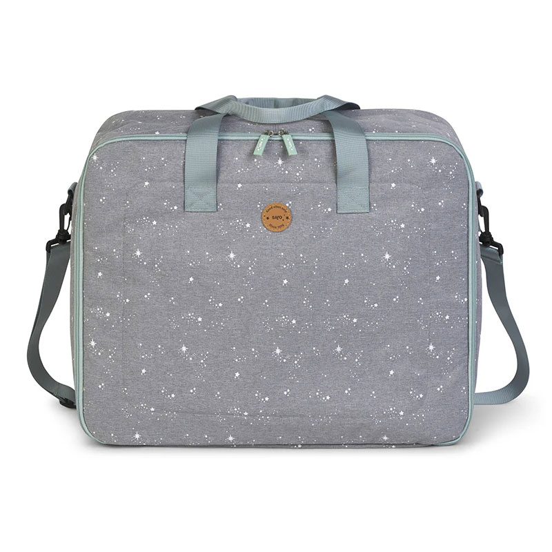 Τσάντα μαιευτηρίου από την εταιρεία Saro σε γκρι χρώμα με πράσινες λεπτομέρειες και αστεράκια στο σχέδιο. Είναι κατασκευασμένη από 100% πολυεστέρα. Έχει μεγάλο χώρο αποθήκευσης που κλείνει με φερμουάρ διπλής κατεύθυνσης. Στο εσωτερικό της έχει ιμάντες που κλείνουν για να παραμένει το περιεχόμενο σταθερό. Περιλαμβάνει μακρύ λουρί ώμου και κοντές λαβές. Όταν το μικρό σας μεγαλώσει, μπορεί να χρησιμοποιηθεί και ως βαλίτσα για τα πράγματά του. Μπορείτε να την κρατήσετε από τα χερούλια ή να την κρεμάσετε στον ώμο από τον ιμάντα.