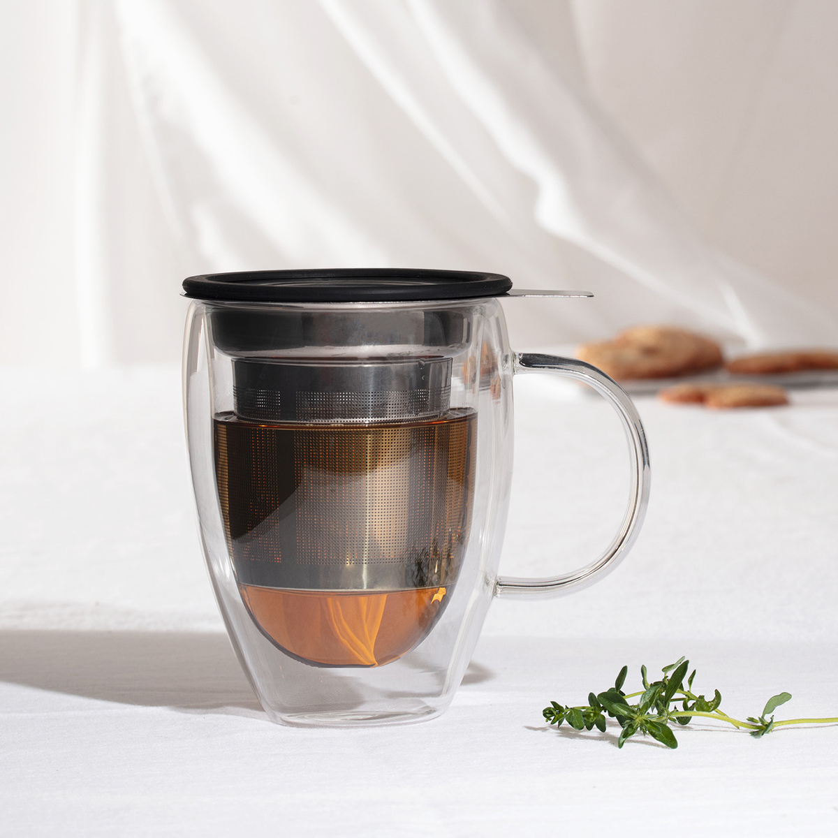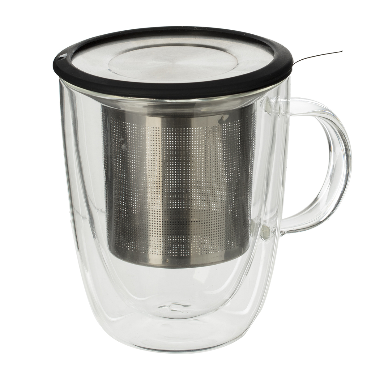 Κούπα με φίλτρο τσαγιού και μοντέρνο σχεδιασμό. Είναι κατασκευασμένη από διάφανο γυαλί και διαθέτει σίτα για να φτιάξετε το δικό σας αφέψημα και να το σερβίρετε εύκολα χωρίς υπολείμματα. Διαθέτει διπλό τοίχωμα που διατηρεί τον ρόφημα ζεστό και αποτρέπει τα εγκαύματα στα δάχτυλα ενώ έχει αντοχή σε υψηλές θερμοκρασίες. Ιδανική τσαγιέρα για να φτιάξετε τσάι ή χαμομήλι γρήγορα, εύκολα και χωρίς ρεύμα. Χωρητικότητα: 300ml.