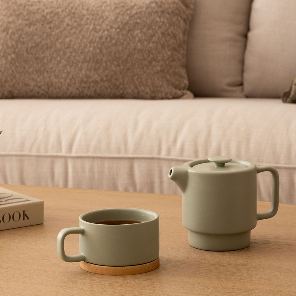 Τσαγιέρα με κούπα σε βεραμάν χρώμα. Είναι κατασκευασμένη από πορσελάνινο υλικό και η βάση είναι ξύλινη από bamboo υλικό. Η τσαγιέρα έχει χωρητικότητα 400ml. Ιδανικό σετ για να απολαύσετε ένα ζεστό και χαλαρωτικό τσάι.