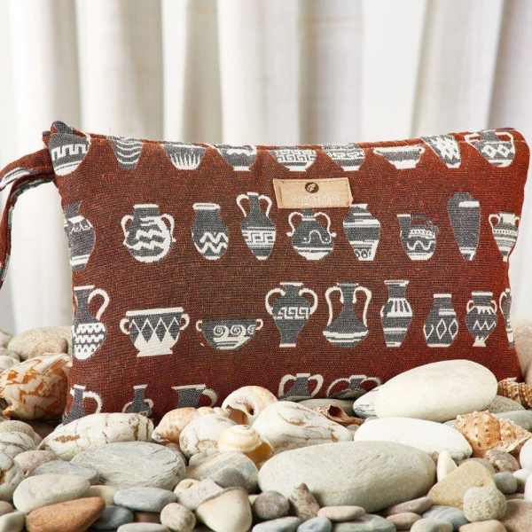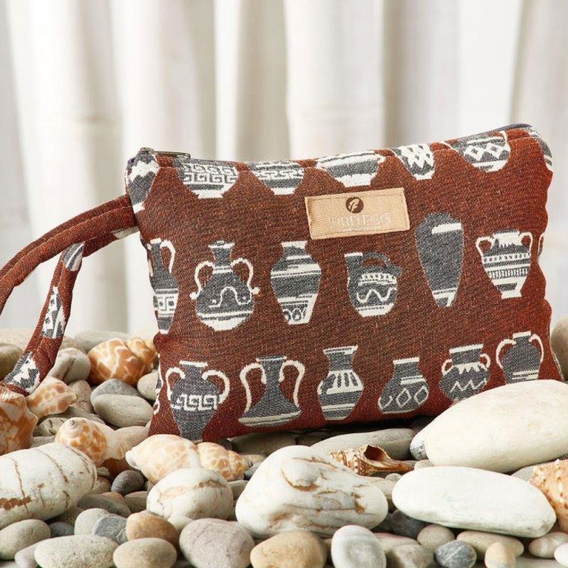 Τσαντάκι θαλάσσης από την εταιρεία Whitegg, σε καφέ χρώμα με εκρού λεπτομέρειες και έθνικ σχέδιο. Είναι κατασκευασμένο από 100% βαμβάκι. Κλείνει με φερμουάρ και διαθέτει λουράκι για να το έχετε μαζί σας παντού. Ιδανικό νεσεσέρ για να μεταφέρετε μικροαντικείμενα εύκολα και χωρίς ογκώδεις τσάντες.
