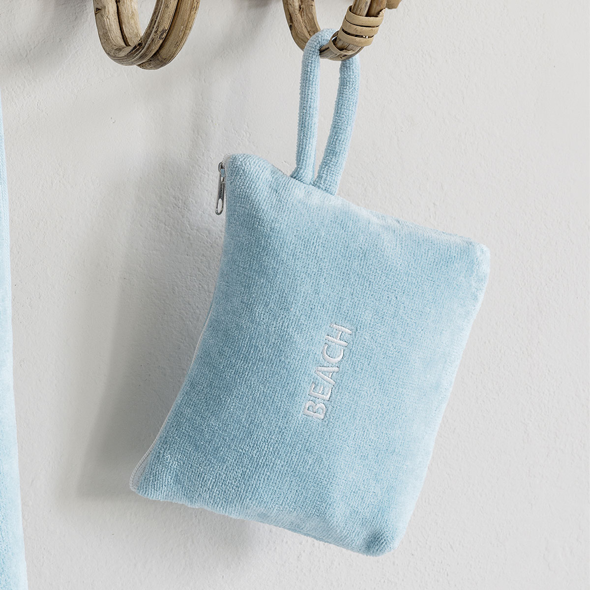 Τσαντάκι παραλίας από την εταιρεία Nima σε γαλάζια απόχρωση με κέντημα. Το εξωτερικό ύφασμα είναι πετσετέ από 100% βαμβάκι. Έχει θηλάκι για εύκολο κράτημα. Συνδυάστε το με τα υπόλοιπα είδη θαλάσσης της ίδιας συλλογής.