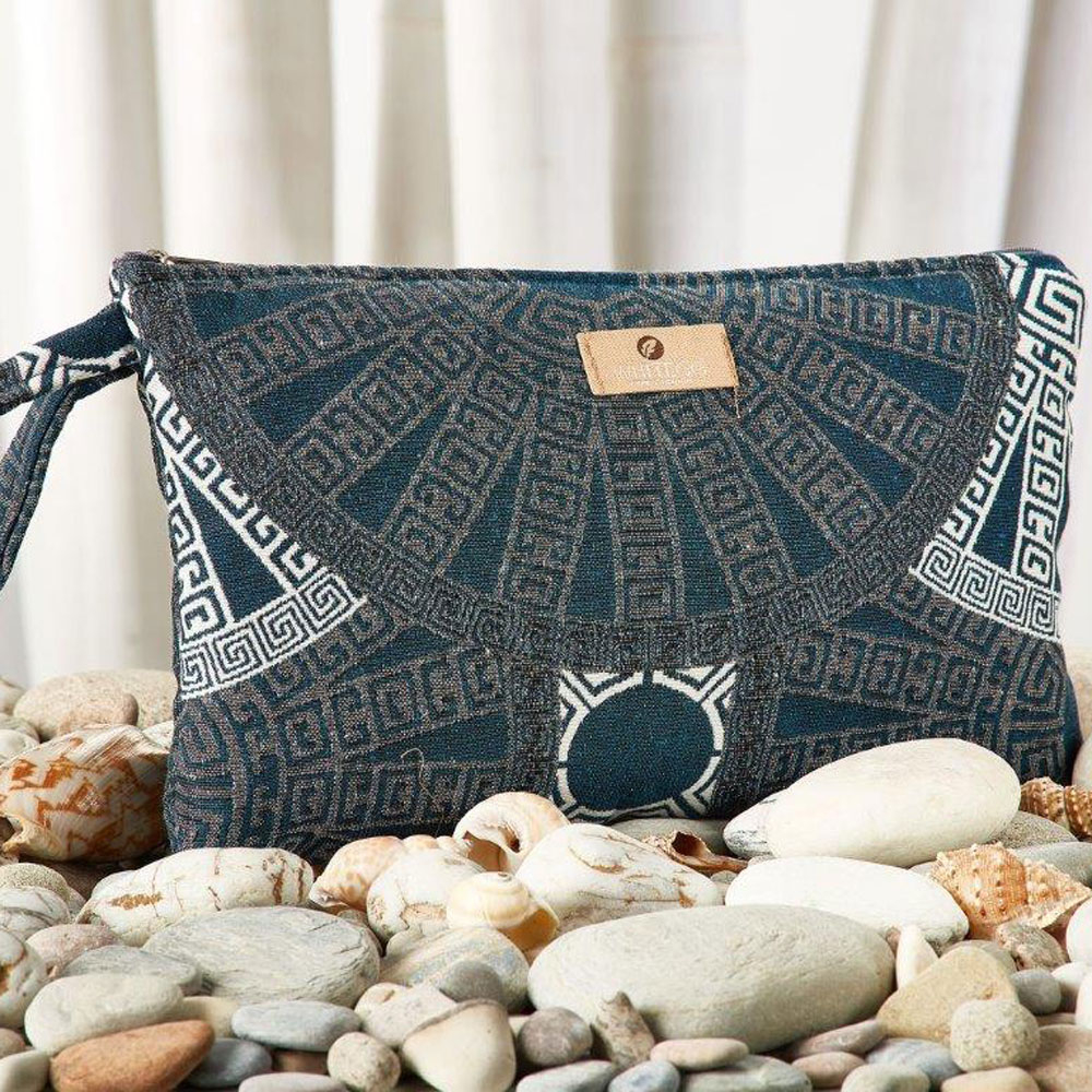 Τσαντάκι θαλάσσης από την εταιρεία Whitegg, σε πετρόλ χρώμα με εκρού λεπτομέρειες και έθνικ σχέδιο. Είναι κατασκευασμένο από 100% βαμβάκι. Κλείνει με φερμουάρ και διαθέτει λουράκι για να το έχετε μαζί σας παντού. Ιδανικό νεσεσέρ για να μεταφέρετε μικροαντικείμενα εύκολα και χωρίς ογκώδεις τσάντες.