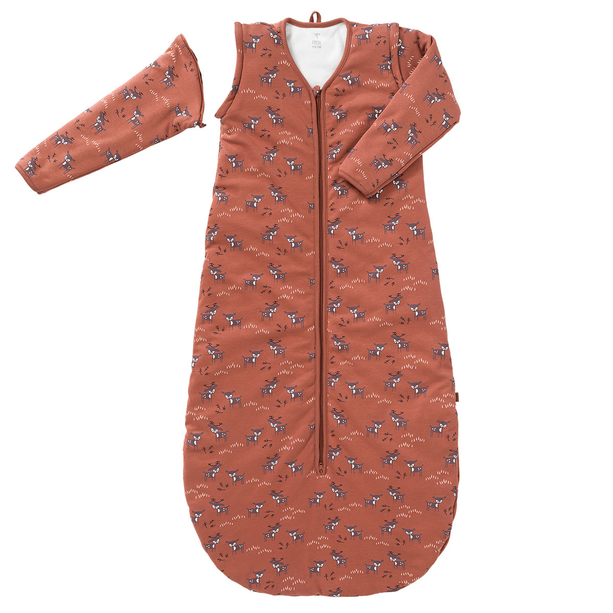 Βρεφικός υπνόσακος από την εταιρεία Fresk στην απόχρωση της τερακότας με ελαφάκια. Είναι ιδιαίτερα πρακτικός καθώς έχει αποσπώμενα μακριά μανίκια. Σας προσφέρει την δυνατότητα να βάλετε ή να βγάλετε τα μανίκια ανάλογα τις ανάγκες σας και την θερμοκρασία του δωματίου σας. Το εξωτερικό ύφασμα είναι 100% οργανικό βαμβάκι και η εσωτερική γέμιση βάτα polyester. Έχει δείκτη θερμότητας 2,8 tog, που τον καθιστά ιδανικό για το χειμώνα και δωμάτια με θερμοκρασία κάτω των 19 βαθμών βαθμούς Κελσίου. Με τον υπνόσακο της Fresk δεν χρειάζεστε κανένα επιπλέον σκέπασμα και το μωράκι σας θα διατηρεί πάντα την σωστή θερμοκρασία. Μεγεθολόγιο: 90εκ. / κατάλληλο για μωράκια από 76-98 εκ., περίπου 6-24 μηνών. Ιδανικός υπνόσακος για μωρά.