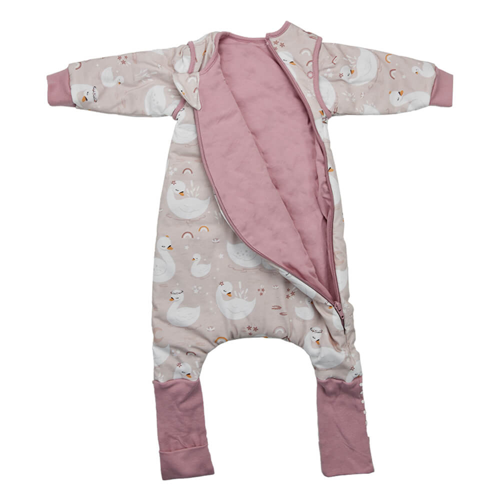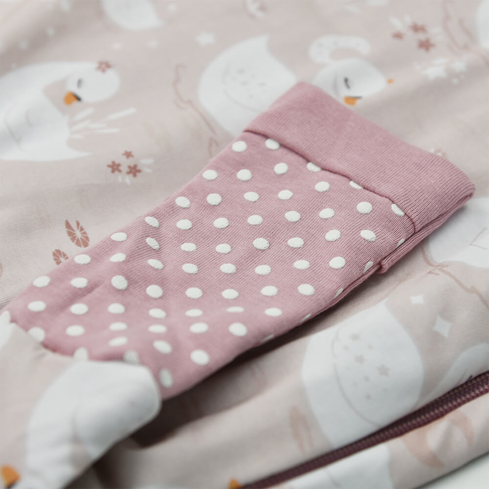 Βρεφικός υπνόσακος σε ροζ αποχρώσεις και σχέδιο κύκνο της εταιρείας Bebe Stars. Κατασκευασμένος από 100% βαμβακερό ύφασμα που προσφέρει απαλότητα και άνεση, με πιστοποίηση Oeko-Tex. Ανοίγει με φερμουάρ που φτάνει χαμηλά στο πόδι. Διαθέτει αφαιρούμενα μανίκια και αναδιπλούμενα πατουσάκια με αντιολισθητική επένδυση. Έχει θερμική απόδοση 2.5 Tog που τον καθιστά ιδανικό για δωμάτια με θερμοκρασία 16-20 βαθμούς Κελσίου. Διατίθεται σε 3 μεγέθη: 12-18 Μηνών (70cm), 18-24 Μηνών (80cm), 24-36 Μηνών (90cm). Ιδανικός υπνόσακος για μωρά.