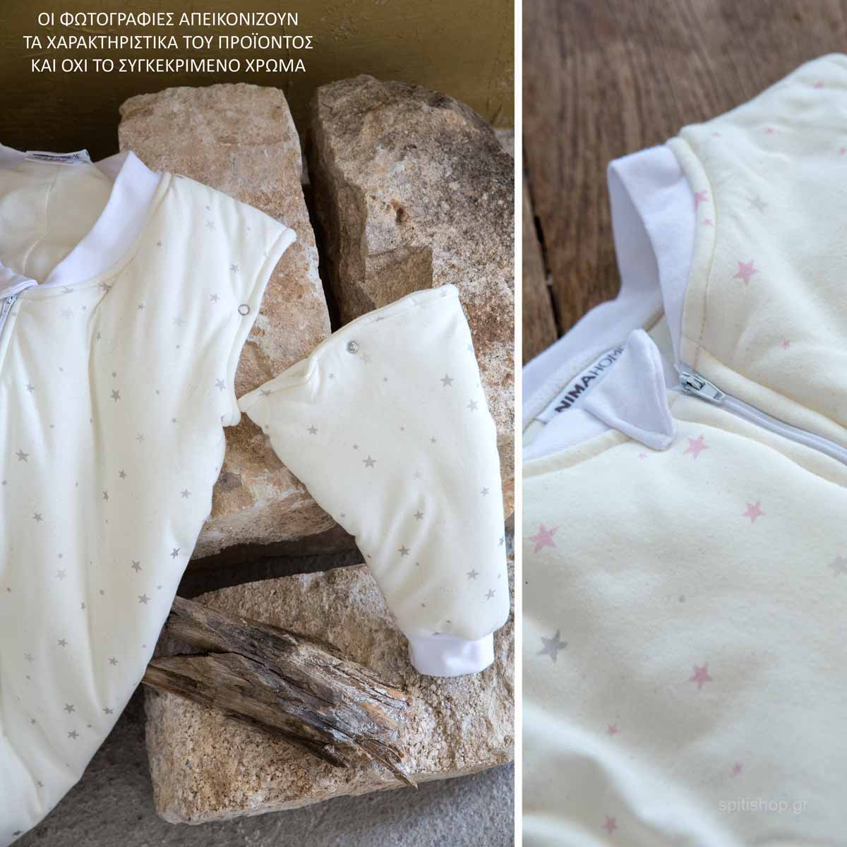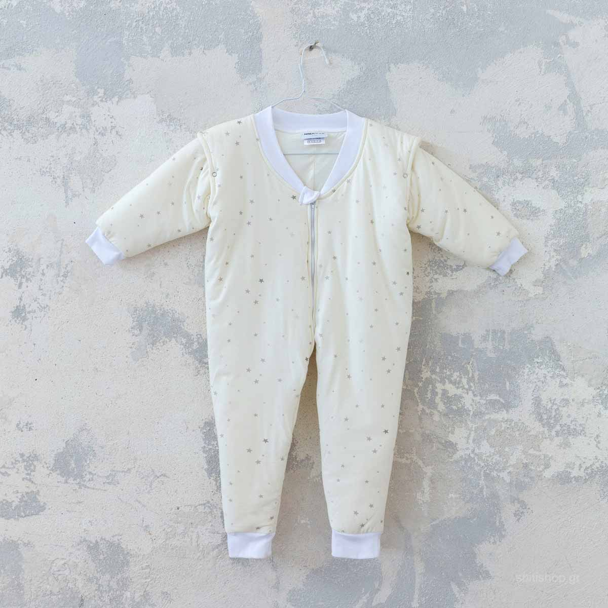 Βρεφική υπνόφορμα για το μωρό σας από την εταιρεία Nima. Το εξωτερικό ύφασμα είναι ζέρσεϋ 100% βαμβάκι για απαλότητα. Εσωτερικά διαθέτει λεπτή πολυεστερική βάτα για ζεστασιά. Έχει φερμουάρ στο μπροστινό μέρος, καθώς και κόπιτσες στα μανίκια ώστε να αφαιρούνται εύκολα. Είναι εκρού με γκρι αστεράκια, ιδανικός για κοριτσάκια και αγοράκια. Η υπνόφορμα έχει συνολικό μήκος 70εκ. και 35εκ. από τον ώμο έως τον καβάλο.