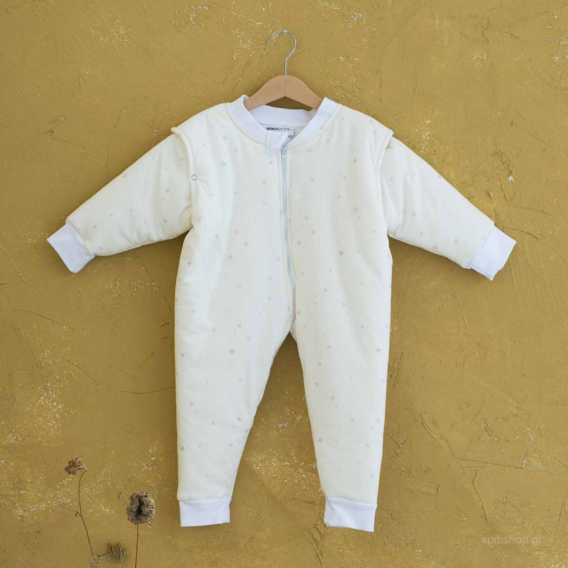 Βρεφικός υπνόσακος για το μωρό σας από την εταιρεία Nima. Το εξωτερικό ύφασμα είναι ζέρσεϋ 100% βαμβάκι για απαλότητα. Εσωτερικά διαθέτει λεπτή πολυεστερική βάτα για ζεστασιά. Έχει φερμουάρ στο μπροστινό μέρος, καθώς και κόπιτσες στα μανίκια ώστε να αφαιρούνται εύκολα. Είναι εκρού με ροζ αστεράκια, Ο βρεφικός υπνόσακος έχει συνολικό μήκος 75εκ. και 40εκ. από τον ώμο έως τον καβάλο. Ιδανικός υπνόσακος για μωρά.
