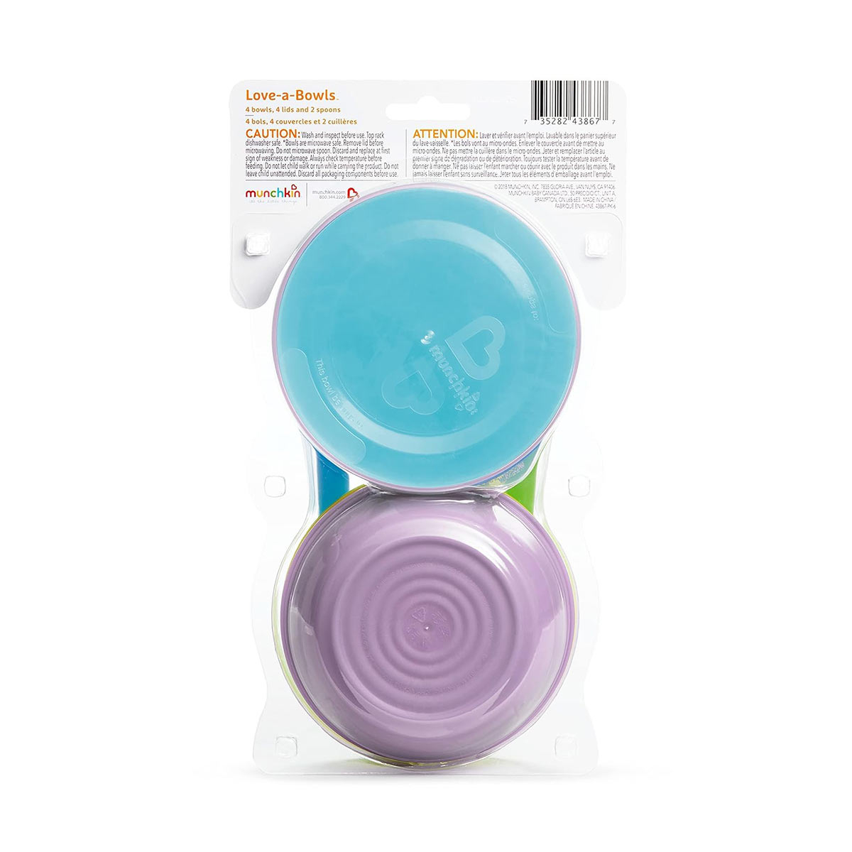 Φαγητοδοχεία με καπάκι και κουτάλια της εταιρείας Munchkin. Όταν τα μωρά αφήνουν το μπουκάλι και αρχίζουν να τρώνε στερεές τροφές, τα μπωλ δεν είναι ποτέ αρκετά. Συνήθως είναι λίγα, λερωμένα ή σπασμένα. Τα Love-a-Bowl δεν λερώνουν, δεν στάζουν και δεν σπάνε. Μπορείτε να τα χρησιμοποιήσετε παντού και αντέχουν στον φούρνο μικροκυμάτων, την κατάψυξη και το πλυντήριο πιάτων. Στο σετ των τεσσάρων μπωλ περιλαμβάνονται τέσσερα καπάκια και δύο κουτάλια με μαλακό άκρο για να αρχίσει το μωρό σας να τρώει στερεές τροφές. Είναι ιδανικά για χρήση καθ' οδόν όταν οι μαμάδες είναι απασχολημένες. Στοιβάζονται το ένα μέσα στο άλλο για να αποθηκεύονται εύκολα. Είναι κατασκευασμένα από πλαστικό υλικό χωρίς BPA, απόλυτα ασφαλές το μωρό σας. Κατάλληλα για ηλικίες 4+ μηνών.