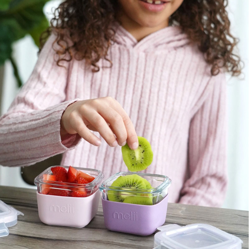 Σετ φαγητοδοχεία 3 τεμαχίων σε ροζ-γκρι και μωβ χρώμα από την εταιρεία Melii. Είναι κατασκευασμένα από βοριοπυριτικό γυαλί που είναι πιο ανθεκτικό στη θερμότητα από το κοινό γυαλί. Διαθέτουν θήκες από σιλικόνη ώστε να μειωθούν οι πιθανότητες θραύσης σε περίπτωση πτώσης. Το σετ διαθέτει 3 τεμάχια χωρητικότητας 160ml το καθένα. Επίσης τα καπάκια μπορούν να αφαιρεθούν εύκολα από τα παιδιά κρατώντας όμως το φαγητό ασφαλές. Κατάλληλα για κατάψυξη, φούρνο μικροκυμάτων, φούρνο και πλυντήριο πιάτων.