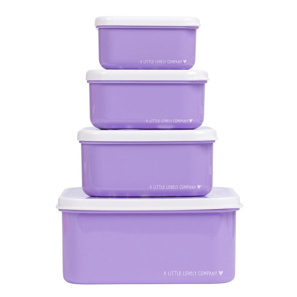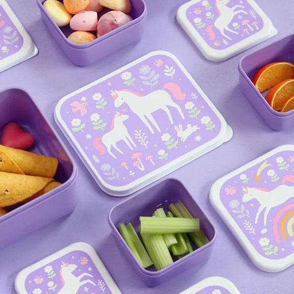 Φαγητοδοχεία της εταιρείας A Little Lovely Company σε τέσσερα διαφορετικά μεγέθη. Έχουν λιλά χρώμα και μονόκερους στο σχέδιο. Είναι ιδανικά για να μεταφέρετε ή να αποθηκεύσετε από το μεσημεριανό γεύμα έως τα φρούτα και τα σνακ του παιδιού. Είναι κατασκευασμένα από πλαστικό υλικό χωρίς BPA και φθαλικές ουσίες. Δεν είναι κατάλληλο για πλυντήριο πιάτων και φούρνο μικροκυμάτων. Συνδυάστε τα με τα υπόλοιπα είδη του ίδιου σχεδίου για ένα ολοκληρωμένο αποτέλεσμα.