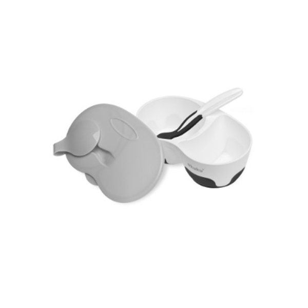 Βρεφικό δοχείο φαγητού με κουτάλι της εταιρείας Akuku σε γκρι-λευκό-μαύρο χρώμα. Είναι κατασκευασμένο από πλαστικό υλικό χωρίς BPA και δεν γλιστράει χάρη στην αντιολισθητική του βάση. Έχει 2 ξεχωριστές θέσεις φαγητού για να μεταφέρετε διαφορετικές παρασκευές και να μην ανακατεύονται. Η μία θέση έχει χωρητικότητα 150ml και η άλλη 200ml. Το καπάκι έχει ειδική θέση για το κουτάλι έτσι ώστε να παραμένει καθαρό χωρίς να το χάνετε. Το κουτάλι είναι μαλακό και δεν ερεθίζει τα ούλα του μωρού σας ή τα δόντια. Ιδανικό φαγητοδοχείο για το σχολείο, την βόλτα ή τα ταξίδια.