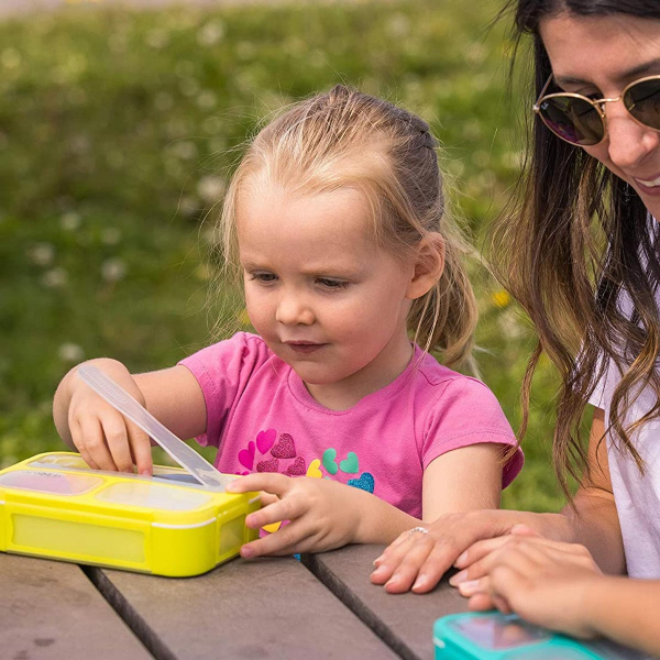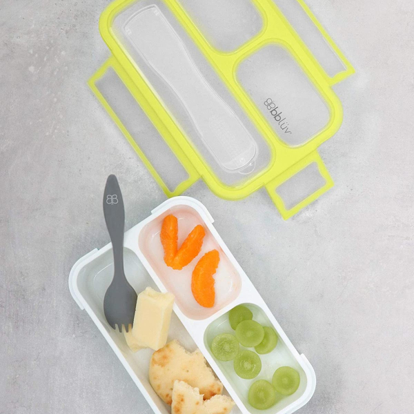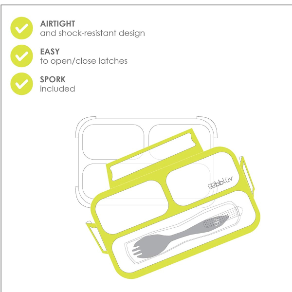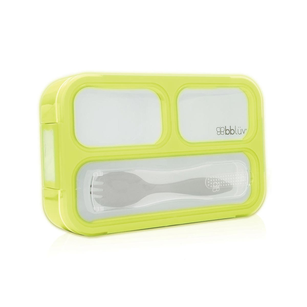 Φαγητοδοχείο τύπου bento box με καπάκι, σε λευκό-λαχανί χρώμα από την εταιρία Bbluv. Είναι κατασκευασμένο από μη τοξικό πλαστικό χωρίς BPA και φθαλικό εστέρα. Διαθέτει 3 χωρίσματα εκ των οποίων τα 2 έχουν χωρητικότητα 100ml και 100ml και το άλλο έχει χωρητικότητα 200ml. Διαθέτει ειδική θήκη στο πάνω μέρος για να τοποθετήσετε το κουταλοπίρουνο, έτσι ώστε να παραμένει καθαρό. Χωράει παντού χάρη στο πρακτικό του μέγεθος.