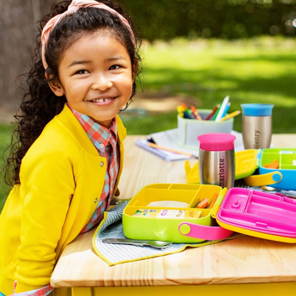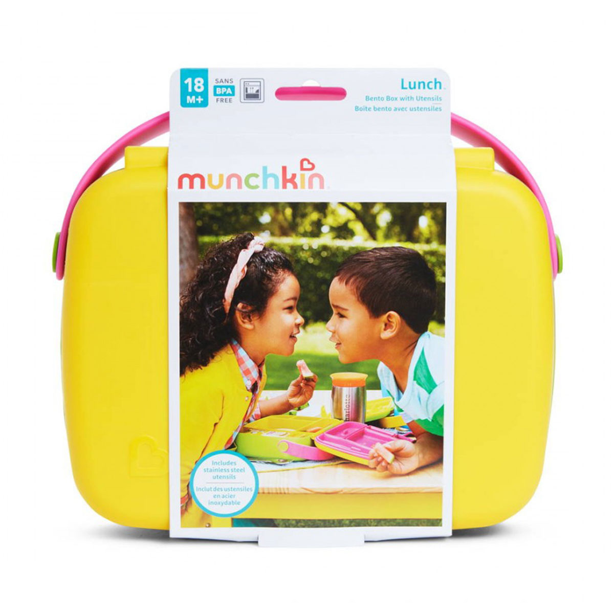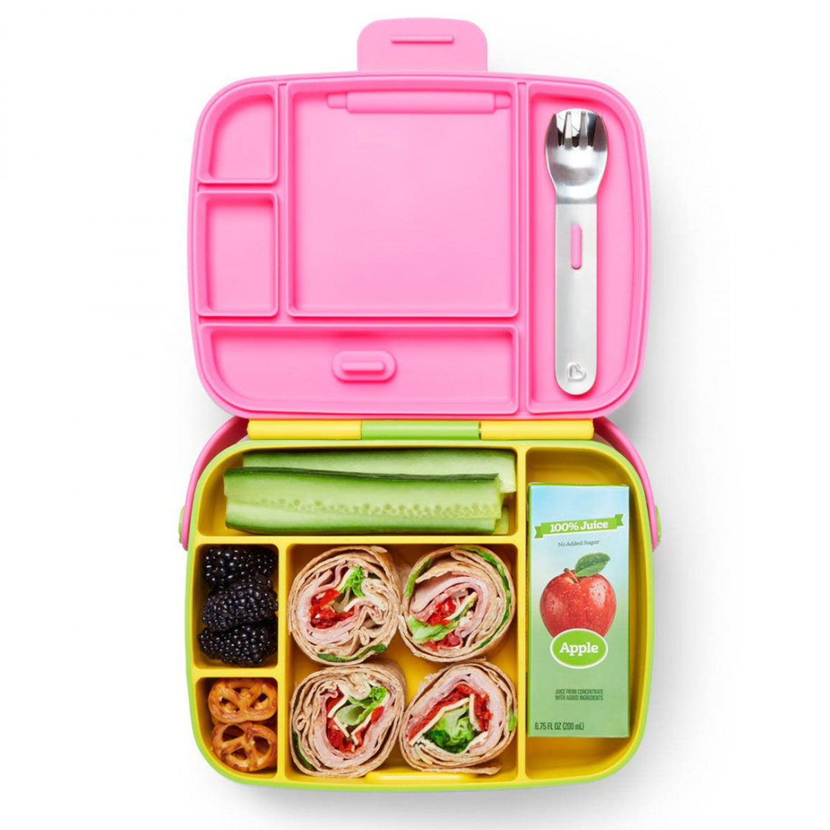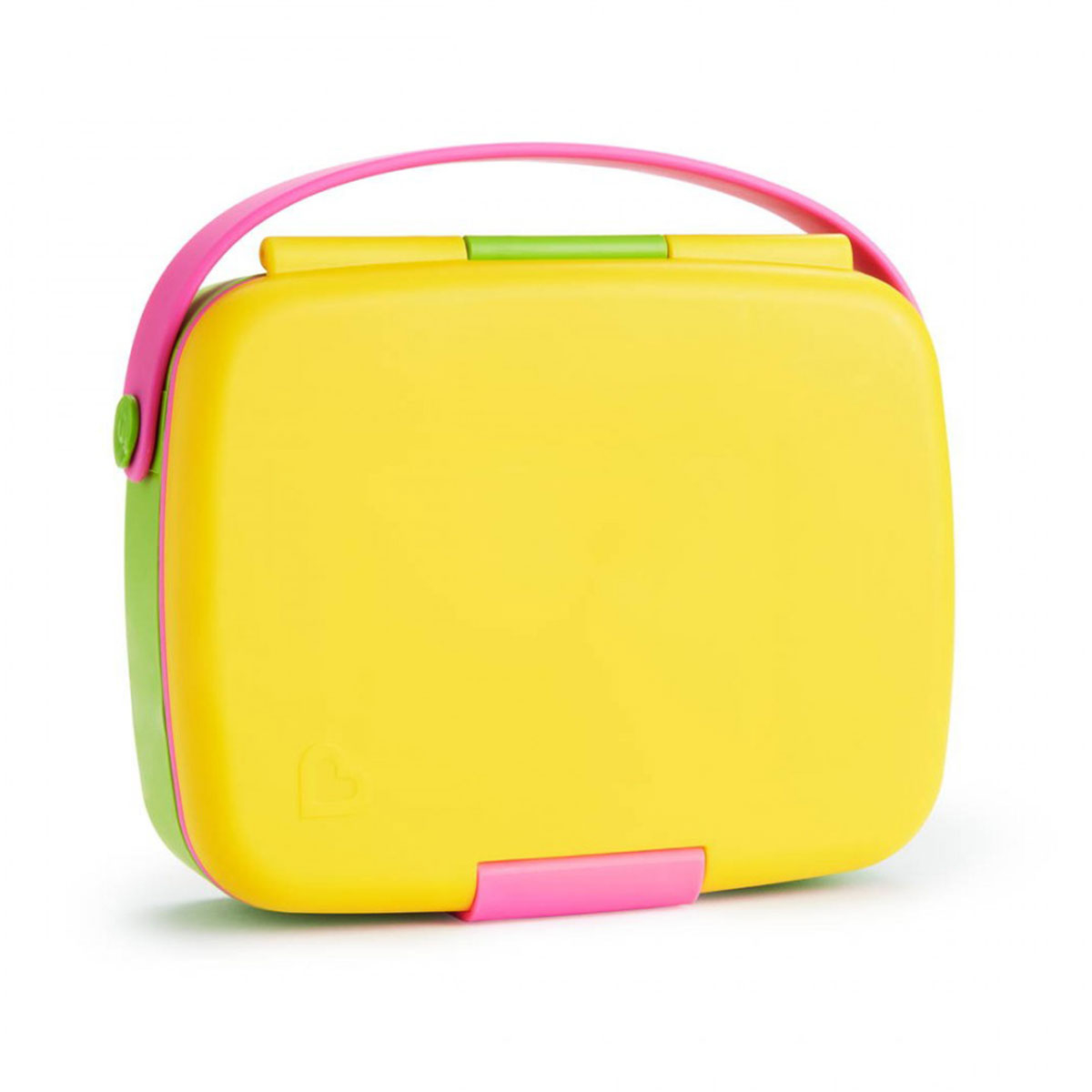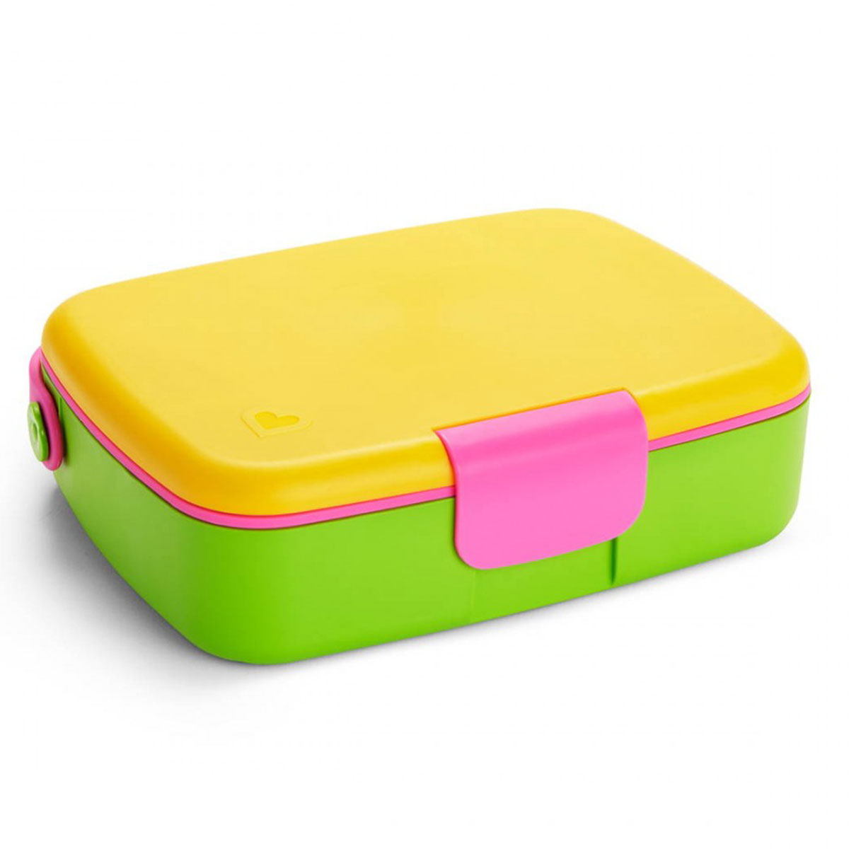 Φαγητοδοχείο τύπου bento box με καπάκι σε ροζ-λαχανί-κίτρινο χρώμα της εταιρείας Munchkin. Ειδικά σχεδιασμένο για μικρές μερίδες και μικρά χεράκια. Έχει 5 διαμερίσματα για να μην ανακατεύονται τα τρόφιμα μεταξύ τους. Σφραγίζει με καπάκι και αποτρέπει το στάξιμο των φαγητών. Περιλαμβάνει επίσης ανοξείδωτα κουταλοπίρουνα που αποθηκεύονται εύκολα στο καπάκι. Είναι ανθεκτικό χωρίς BPA, και πλένεται εύκολα στο πλυντήριο πιάτων. Ταιριάζει στις περισσότερες παιδικές τσάντες . Κατάλληλο για 18+ Μηνών. Όταν είναι κλειστό, η διάστασή του είναι 22εκ.Μήκος, 21εκ.Πλάτος (μαζί με το χερούλι) και 7εκ.Ύψος. Όταν είναι ανοιχτό, η διάστασή του είναι 22εκ.Μήκος, 33εκ.Πλάτος (μαζί με το χερούλι) και 3.5εκ.Ύψος.