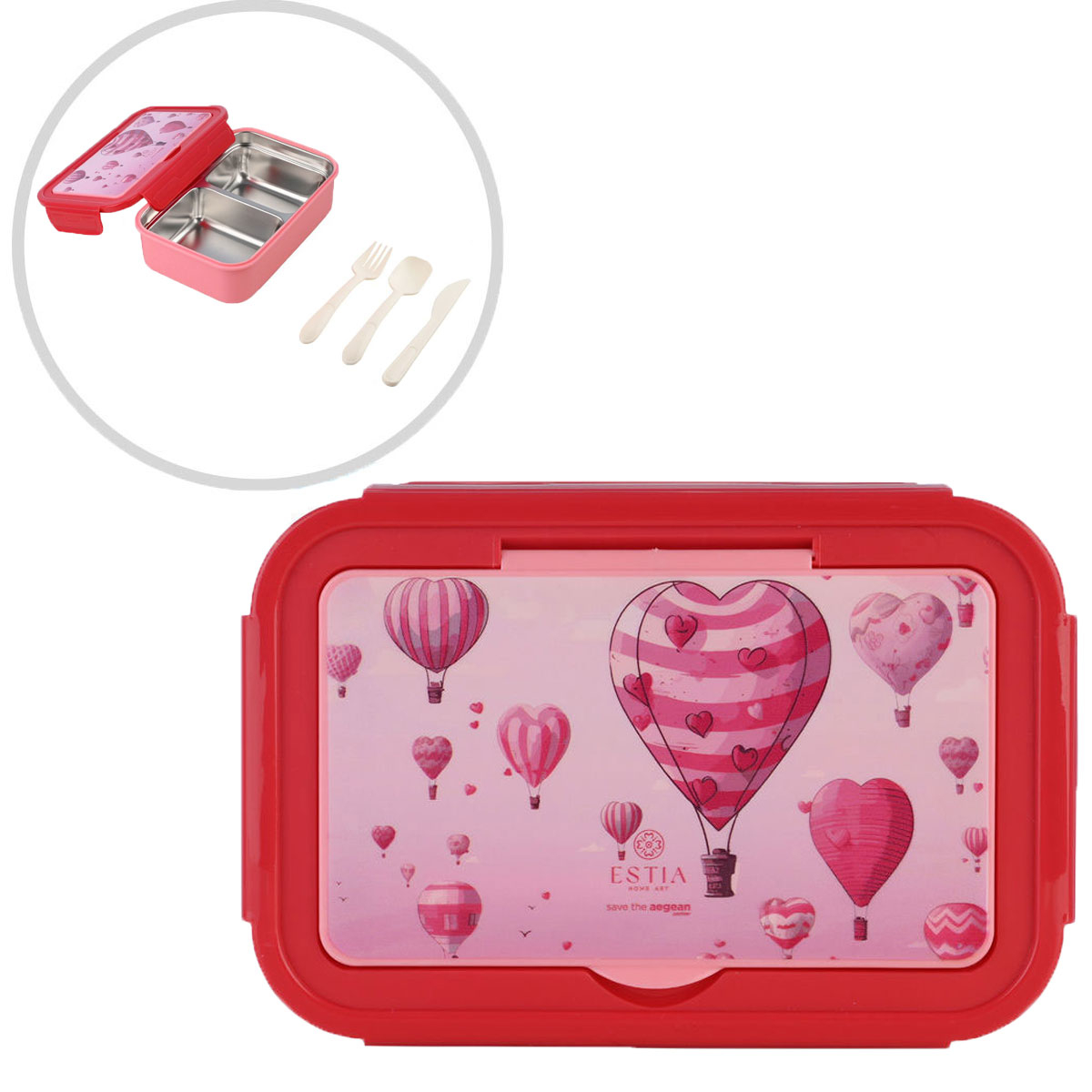 Φαγητοδοχείο τύπου bento box 900ml σε ροζ χρώμα, με κόκκινες λεπτομέρειες και σχέδιο καρδιές από την εταιρεία εstia. Είναι μέρος της συλλογής "Save The Aegean". Η εταιρεία εstia συνεισφέρει στον οργανισμό "Save The Aegean" με 1% επί των πωλήσεων, για καθαρότερες θάλασσες και ένα καλύτερο αύριο. Είναι κατασκευασμένο από πλαστικό υλικό εξωτερικά ενώ το εσωτερικό σκεύος είναι από ανοξείδωτο ατσάλι. Διαθέτει 2 χωρίσματα για να τοποθετείτε τα φαγητά του μικρού σας χωρίς να ανακατεύονται μεταξύ τους καθώς και κουτάλι, πιρούνι και μαχαίρι. Χωράει παντού χάρη στο πρακτικό του μέγεθος.