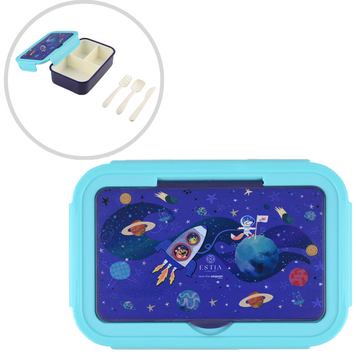 Φαγητοδοχείο τύπου bento box 1400ml σε μπλε χρώμα, με γαλάζιες λεπτομέρειες και σχέδιο διάστημα από την εταιρεία εstia. Είναι μέρος της συλλογής "Save The Aegean". Η εταιρεία εstia συνεισφέρει στον οργανισμό "Save The Aegean" με 1% επί των πωλήσεων, για καθαρότερες θάλασσες και ένα καλύτερο αύριο. Είναι κατασκευασμένο από πλαστικό υλικό. Διαθέτει 2 χωρίσματα για να τοποθετείτε τα φαγητά του μικρού σας χωρίς να ανακατεύονται μεταξύ τους καθώς και κουτάλι, πιρούνι και μαχαίρι. Χωράει παντού χάρη στο πρακτικό του μέγεθος.