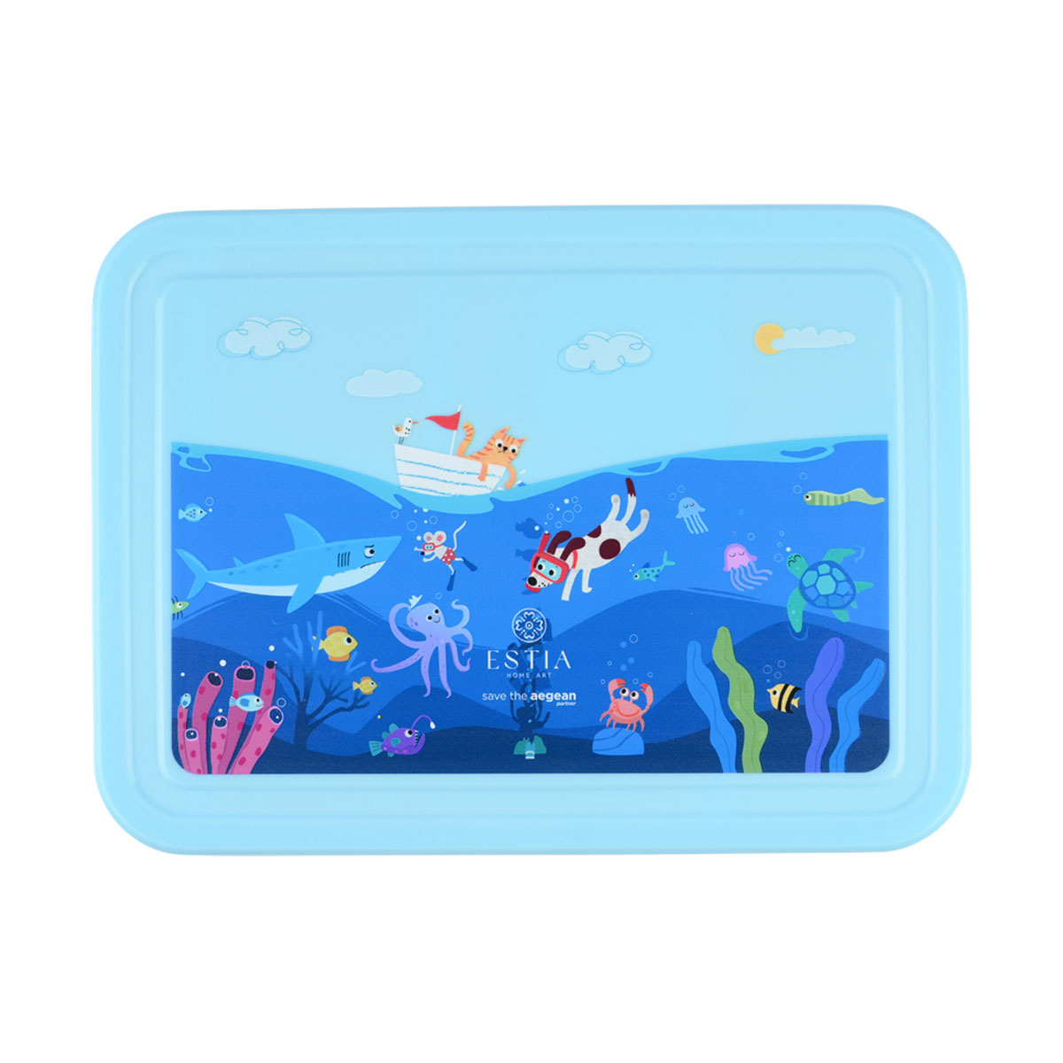 Φαγητοδοχείο τύπου bento box 1.33lt σε μπλε χρώμα, με γαλάζιες λεπτομέρειες και σχέδιο θαλάσσια ζωάκια από την εταιρεία εstia. Είναι μέρος της συλλογής "Save The Aegean". Η εταιρεία εstia συνεισφέρει στον οργανισμό "Save The Aegean" με 1% επί των πωλήσεων, για καθαρότερες θάλασσες και ένα καλύτερο αύριο. Είναι κατασκευασμένο από πλαστικό υλικό. Διαθέτει 6 χωρίσματα εκ των οποίων το 1 είναι η θήκη για το κουτάλι και το πιρούνι. Διαθέτει ειδική θήκη για μικρά σνακ ή σωσάκια. Χωράει παντού χάρη στο πρακτικό του μέγεθος.