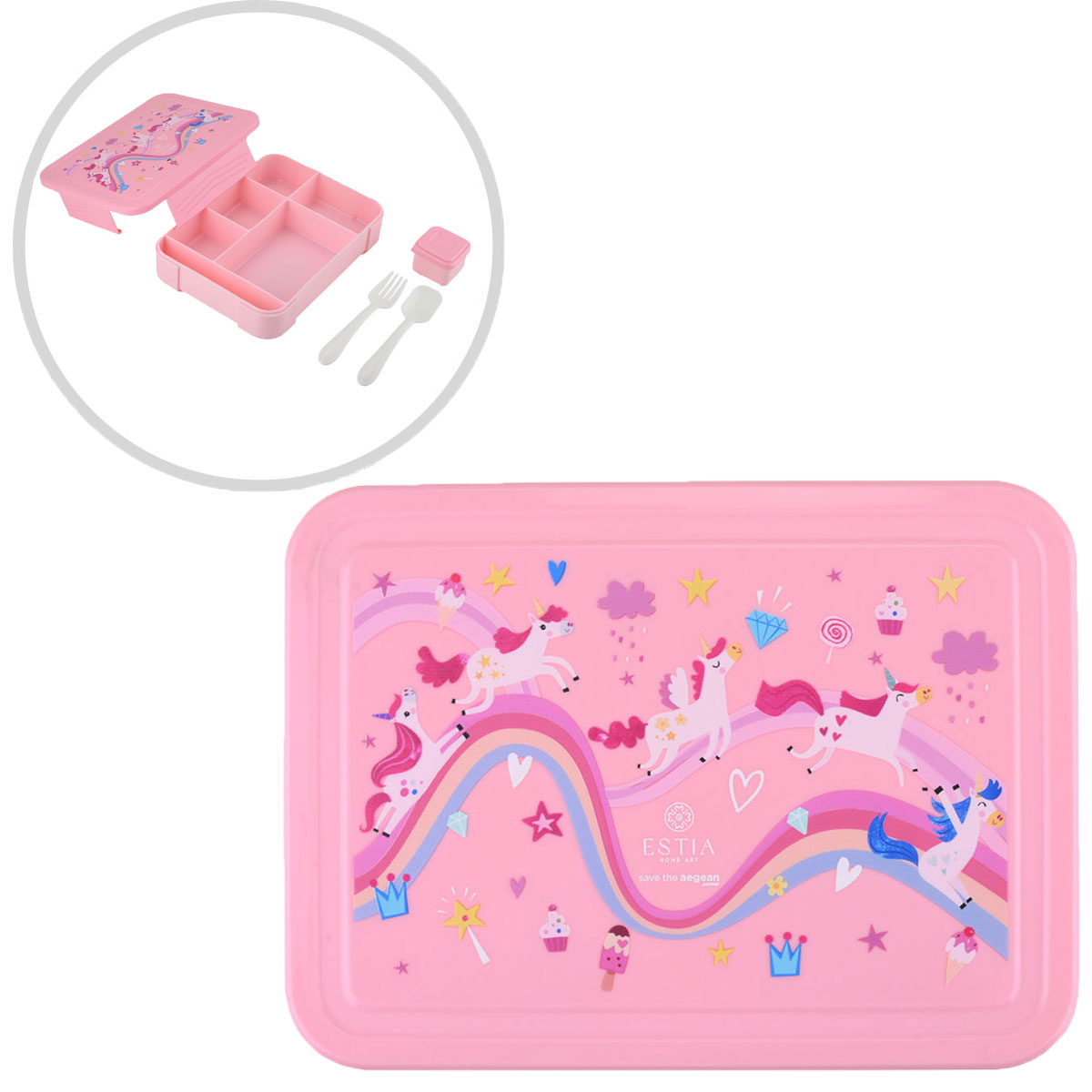 Φαγητοδοχείο τύπου bento box 1.33lt σε ροζ χρώμα, με πολύχρωμες λεπτομέρειες και σχέδιο μονόκερου από την εταιρεία εstia. Είναι μέρος της συλλογής "Save The Aegean". Η εταιρεία εstia συνεισφέρει στον οργανισμό "Save The Aegean" με 1% επί των πωλήσεων, για καθαρότερες θάλασσες και ένα καλύτερο αύριο. Είναι κατασκευασμένο από πλαστικό υλικό. Διαθέτει 6 χωρίσματα εκ των οποίων το 1 είναι η θήκη για το κουτάλι και το πιρούνι. Διαθέτει ειδική θήκη για μικρά σνακ ή σωσάκια. Χωράει παντού χάρη στο πρακτικό του μέγεθος.