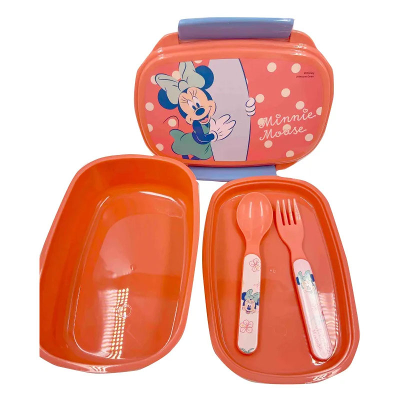 Παιδικό φαγητοδοχείο τύπου bento box με κουτάλι και πιρούνι σετ από την εταιρεία Gim. Έχει τερακότα χρώμα με πολύχρωμες λεπτομέρειες και ηρωίδα της Disney Minnie στο σχέδιο. Είναι κατασκευασμένα από υψηλής ποιότητας πλαστικό χωρίς BPA. Αποτελείται από 2 αποσπώμενα πιατάκια για να διαχωρίζετε εύκολα τα τρόφιμα. Επίσης, διαθέτει ένα κουταλάκι και ένα πιρουνάκι. Κλείνει αεροστεγώς για να αποφεύγονται οι ανεπιθύμητες διαρροές. Χωράει το μεσημεριανό, τα φρούτα ή το σνακ του παιδιού σας και είναι ιδανικό για το σχολείο ή την βόλτα.
