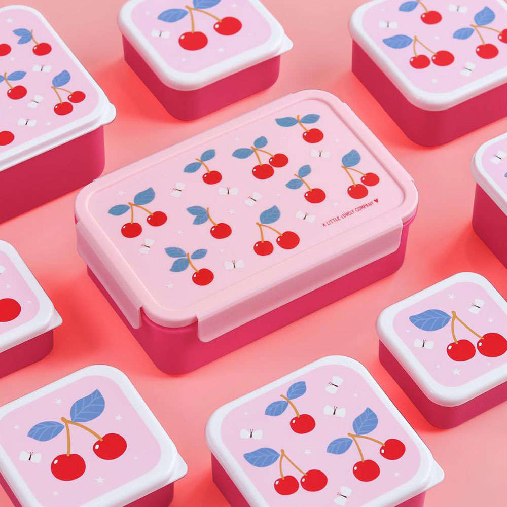 Φαγητοδοχείο τύπου bento box από την εταιρία A Little Lovely Company. Έχει ροζ-φούξια χρώμα και κερασάκια στο σχέδιο. Είναι κατασκευασμένο από πολυπροπυλένιο, χωρίς BPA και φθαλικές ενώσεις. Διαθέτει αφαιρούμενο συρόμενο διαχωριστικό για να τοποθετείτε τα φαγητά του μικρού σας χωρίς να ανακατεύονται μεταξύ τους. Με αεροστεγές κλείσιμο για να μεταφέρετε ή να αποθηκεύσετε από το μεσημεριανό γεύμα έως τα φρούτα και τα σνακ του παιδιού χωρίς διαρροές. Συνδυάστε το με τα υπόλοιπα είδη του ίδιου σχεδίου για ένα ολοκληρωμένο αποτέλεσμα. Έχει χωρητικότητα 1.2 λίτρα. Διαστάσεις εσωτερικού δίσκου 12.5εκ.Μx9εκ.Πx5.5εκ.Υ.
