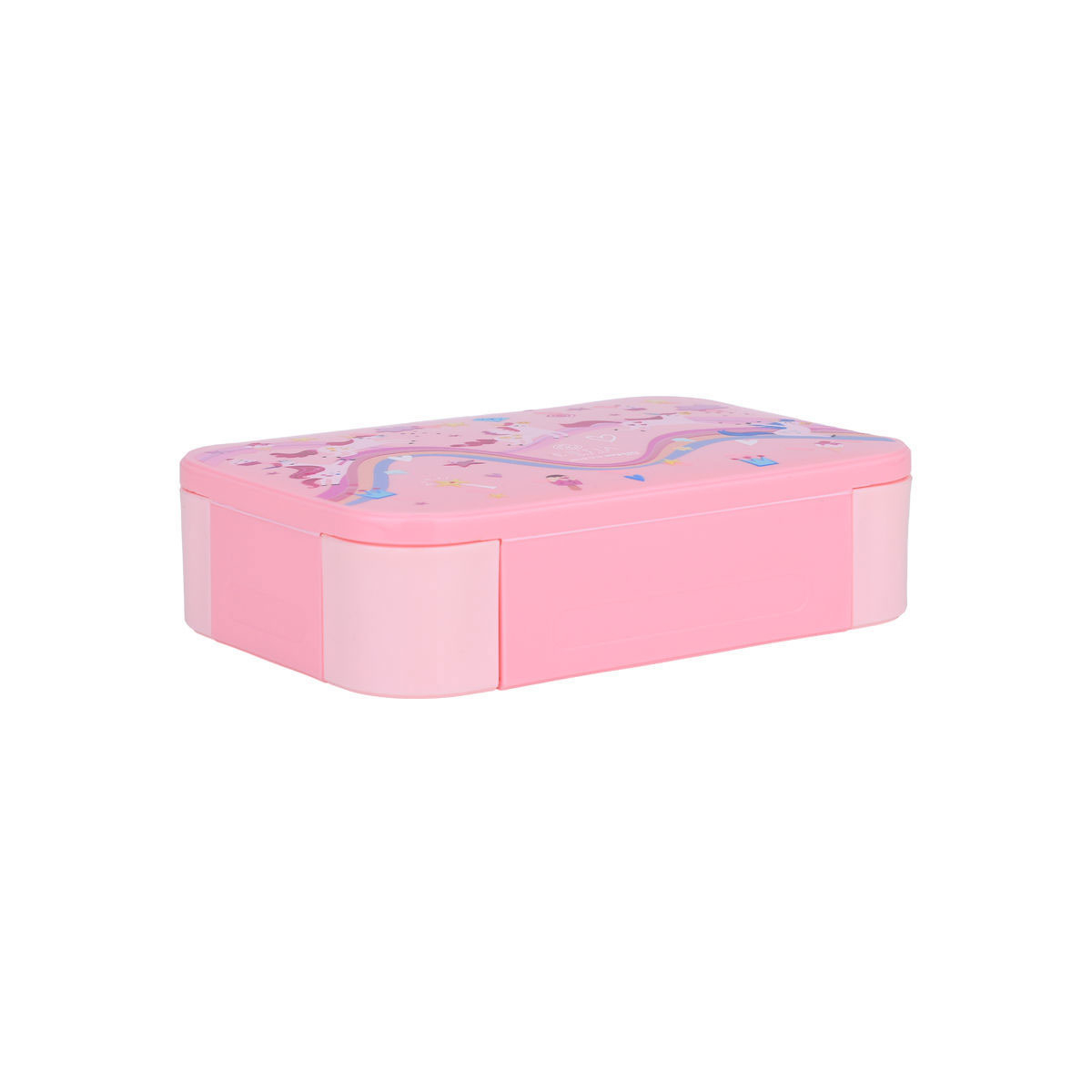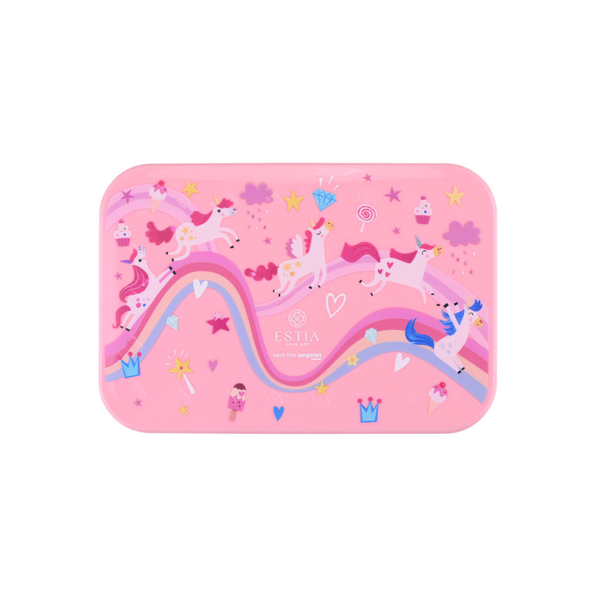 Φαγητοδοχείο τύπου bento box 900ml σε ροζ χρώμα, με πολύχρωμες λεπτομέρειες και σχέδιο μονόκερος από την εταιρεία εstia. Είναι μέρος της συλλογής "Save The Aegean". Η εταιρεία εstia συνεισφέρει στον οργανισμό "Save The Aegean" με 1% επί των πωλήσεων, για καθαρότερες θάλασσες και ένα καλύτερο αύριο. Είναι κατασκευασμένο από πλαστικό υλικό. Διαθέτει αποσπώμενη θήκη για τον εύκολο διαχωρισμό των τροφών, μπορεί να χρησιμοποιηθεί δίχως την αποσπώμενη θήκη. Χωράει το μεσημεριανό, τα φρούτα ή το σνακ του παιδιού σας και είναι ιδανικό για το σχολείο ή την βόλτα.