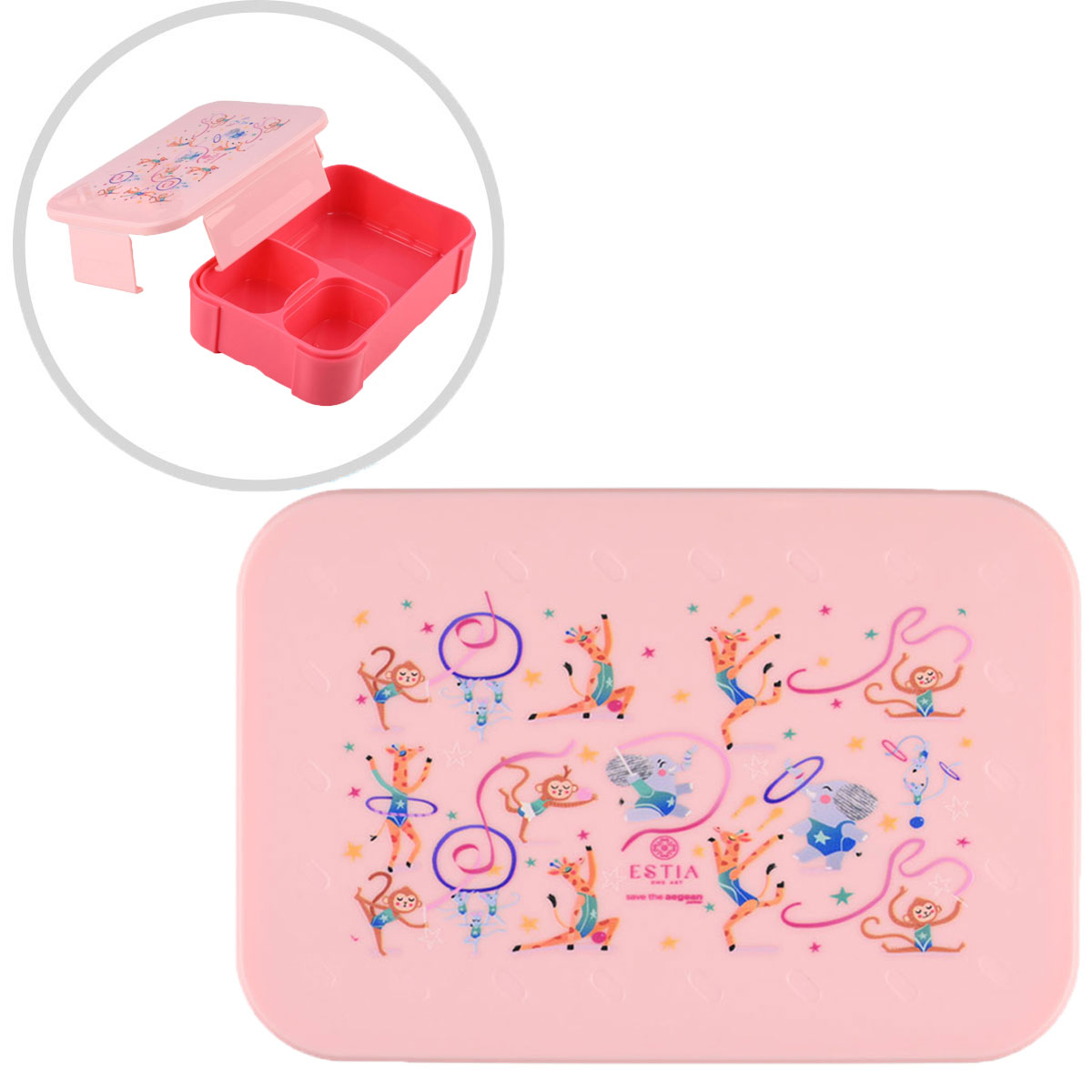Φαγητοδοχείο τύπου bento box 900ml σε ροζ χρώμα, με φούξια λεπτομέρειες και σχέδιο ζωάκια από την εταιρεία εstia. Είναι μέρος της συλλογής "Save The Aegean". Η εταιρεία εstia συνεισφέρει στον οργανισμό "Save The Aegean" με 1% επί των πωλήσεων, για καθαρότερες θάλασσες και ένα καλύτερο αύριο. Είναι κατασκευασμένο από πλαστικό υλικό. Διαθέτει αποσπώμενη θήκη για τον εύκολο διαχωρισμό των τροφών, μπορεί να χρησιμοποιηθεί δίχως την αποσπώμενη θήκη. Χωράει το μεσημεριανό, τα φρούτα ή το σνακ του παιδιού σας και είναι ιδανικό για το σχολείο ή την βόλτα.