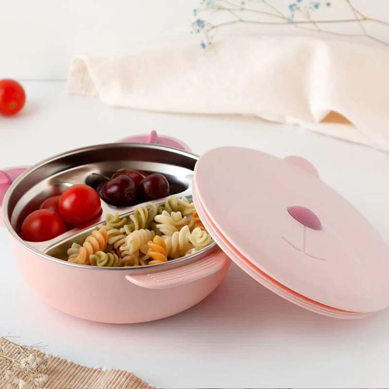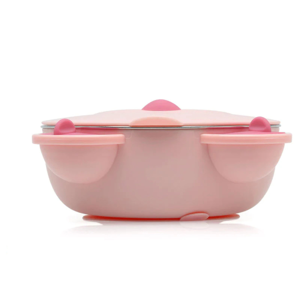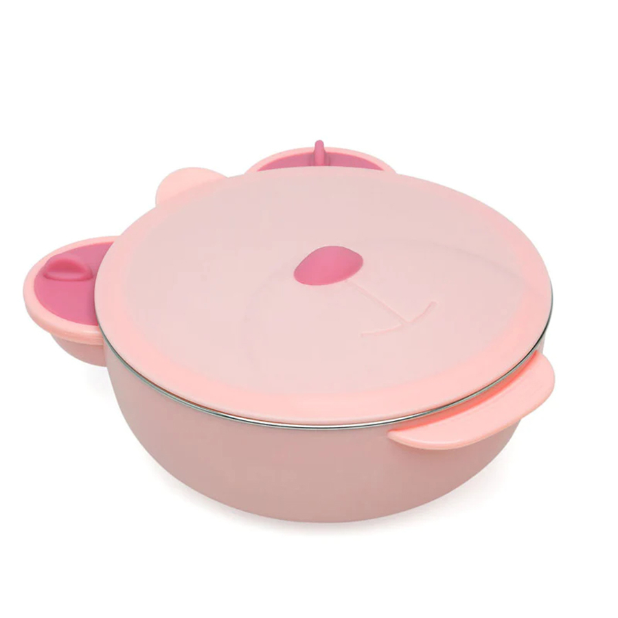 Φαγητοδοχείο τύπου bento box χωρητικότητας 300ml σε ροζ χρώμα και σχέδιο αρκουδάκι από την εταιρεία Kiokids. Το εξωτερικό υλικό είναι από πλαστικό ασφαλές υλικό για τρόφιμα χωρίς BPA, μόλυβδο και φθαλικά ενώ το εσωτερικό σκεύος είναι από ανοξείδωτο ατσάλι. Είναι ιδανικό για τη μεταφορά φαγητού και μπορείτε να το χρησιμοποιήσετε οποιαδήποτε στιγμή, τόσο εντός όσο και εκτός σπιτιού. Το καπάκι του είναι αεροστεγές, εμποδίζοντας τα υγρά να χυθούν ή να διαρρεύσουν κατά λάθος. Χάρη στην βεντούζα του, παραμένει στερεωμένο σε τραπέζι ή παιδικό καρεκλάκι. Η βεντούζα που διαθέτει στο κάτω μέρος του σκεύους σας βοηθά να μπορείτε να ταΐζετέ το μικρό σας με περισσότερη ασφάλεια και περισσότερη ηρεμία, αφού το παιδί δεν θα μπορεί να το ρίξει. Διαθέτει 3 θήκες κατασκευασμένες από ανοξείδωτο ατσάλι και χωρισμένες για να μην ανακατεύονται τα τρόφιμα. Μια οπή εξαερισμού ανοίγει από τη μύτη του για να διώξει την περίσσεια ποσότητα θερμότητας και ατμού, εάν υπάρχει. Κατάλληλο για ηλικίες 4+ μηνών. Δεν είναι κατάλληλο για φούρνο μικροκυμάτων.