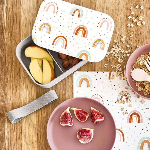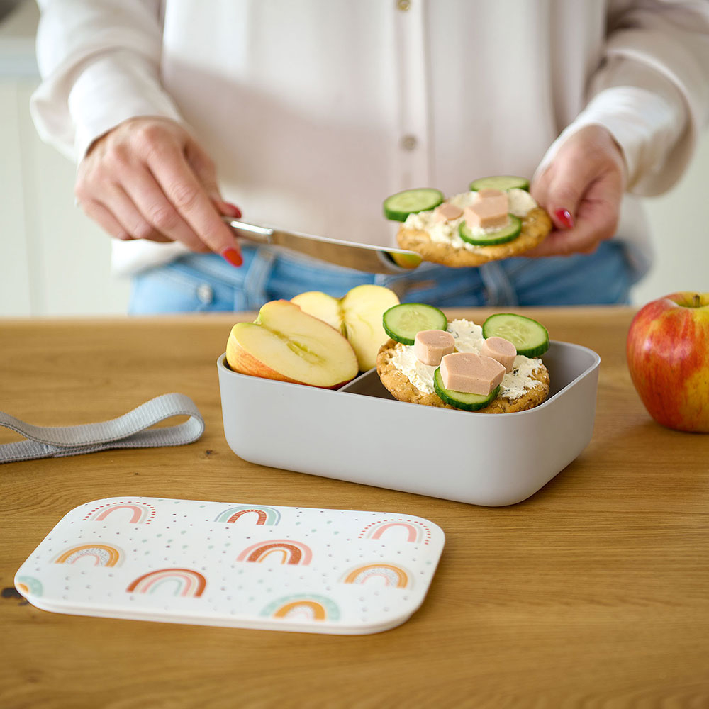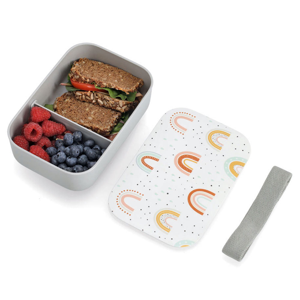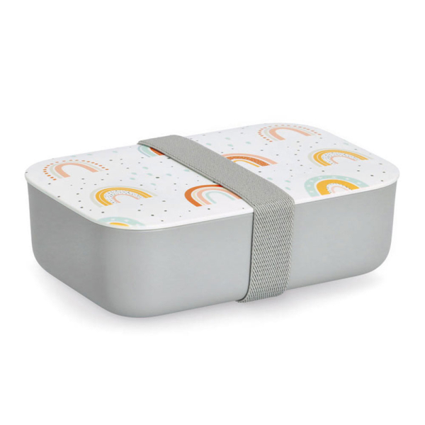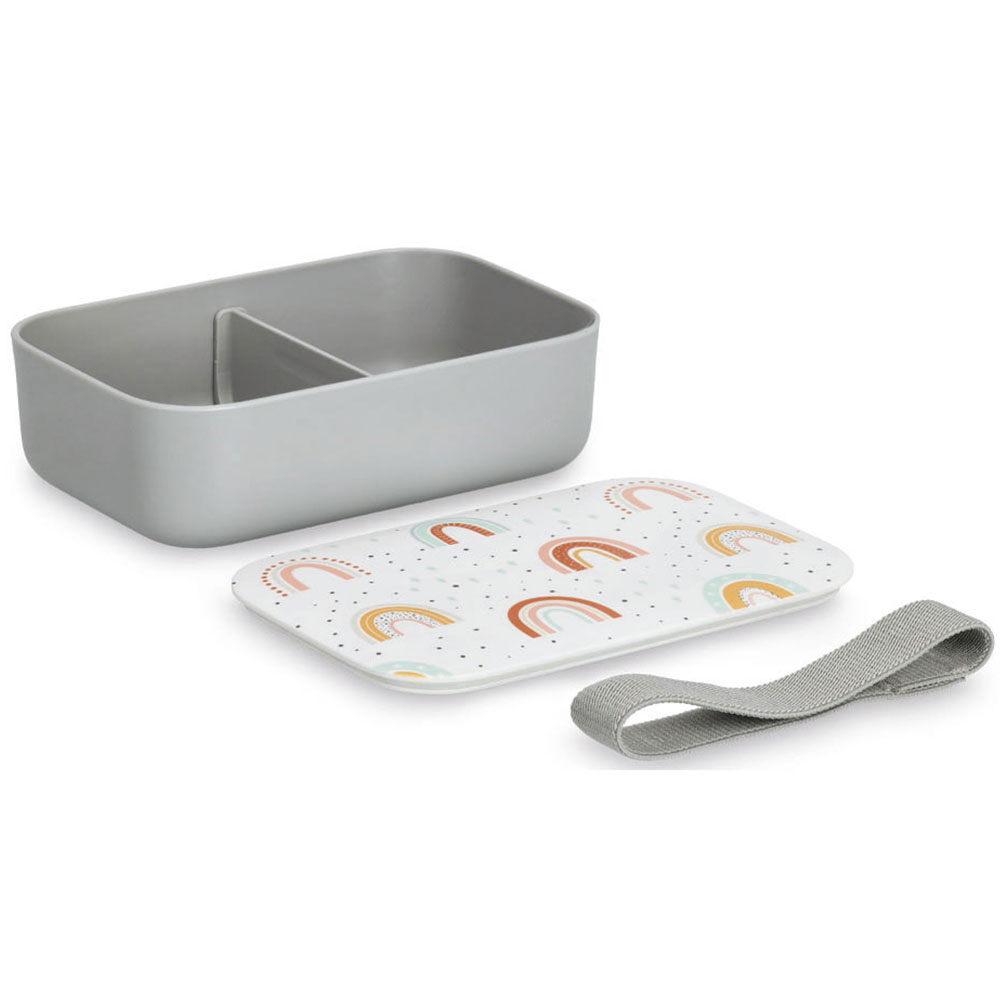 Ορθογώνιο φαγητοδοχείο τύπου bento box σε γκρι χρώμα με λευκό καπάκι και πολύχρωμο σχέδιο με ουράνιο τόξο. Είναι κατασκευασμένο από πλαστικό υλικό (ανθεκτικό PET). Διαθέτει μετακινούμενο διαχωριστικό τροφίμων για να χωρίζετε τις μερίδες όπως επιθυμείτε. Μπορεί να κλείσει με ασφάλεια καθώς διαθέτει λάστιχο συγκράτησης. Το καπάκι διαθέτει δακτύλιο σιλικόνης για αεροστεγή κλείσιμο. Ιδανικό για αποθήκευση και μεταφορά μεσημεριανού γεύματος, φρούτων και σνακ του παιδιού.