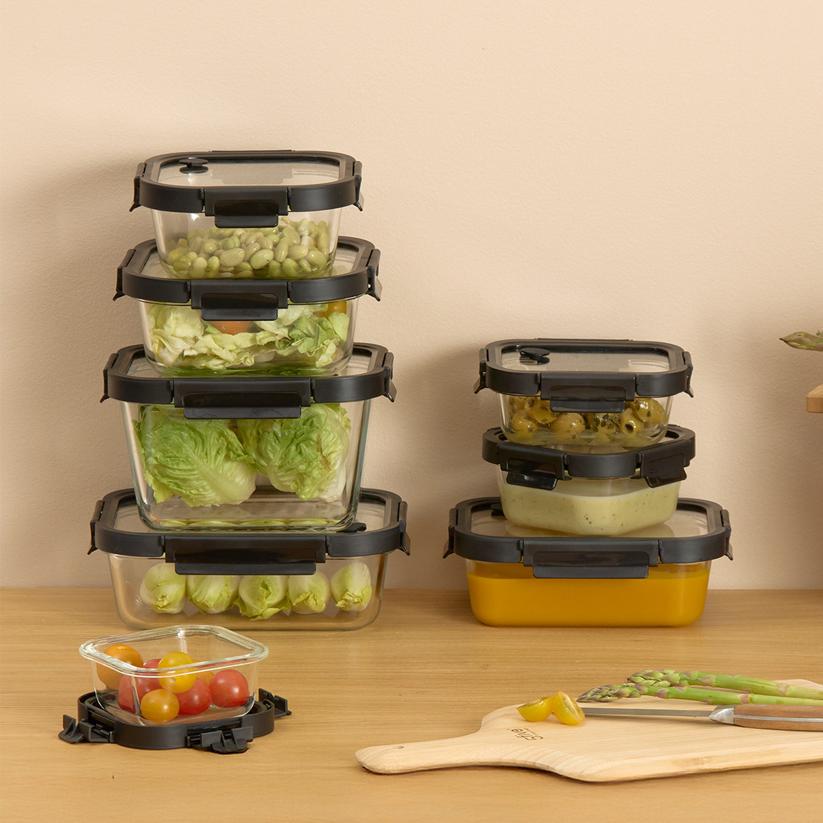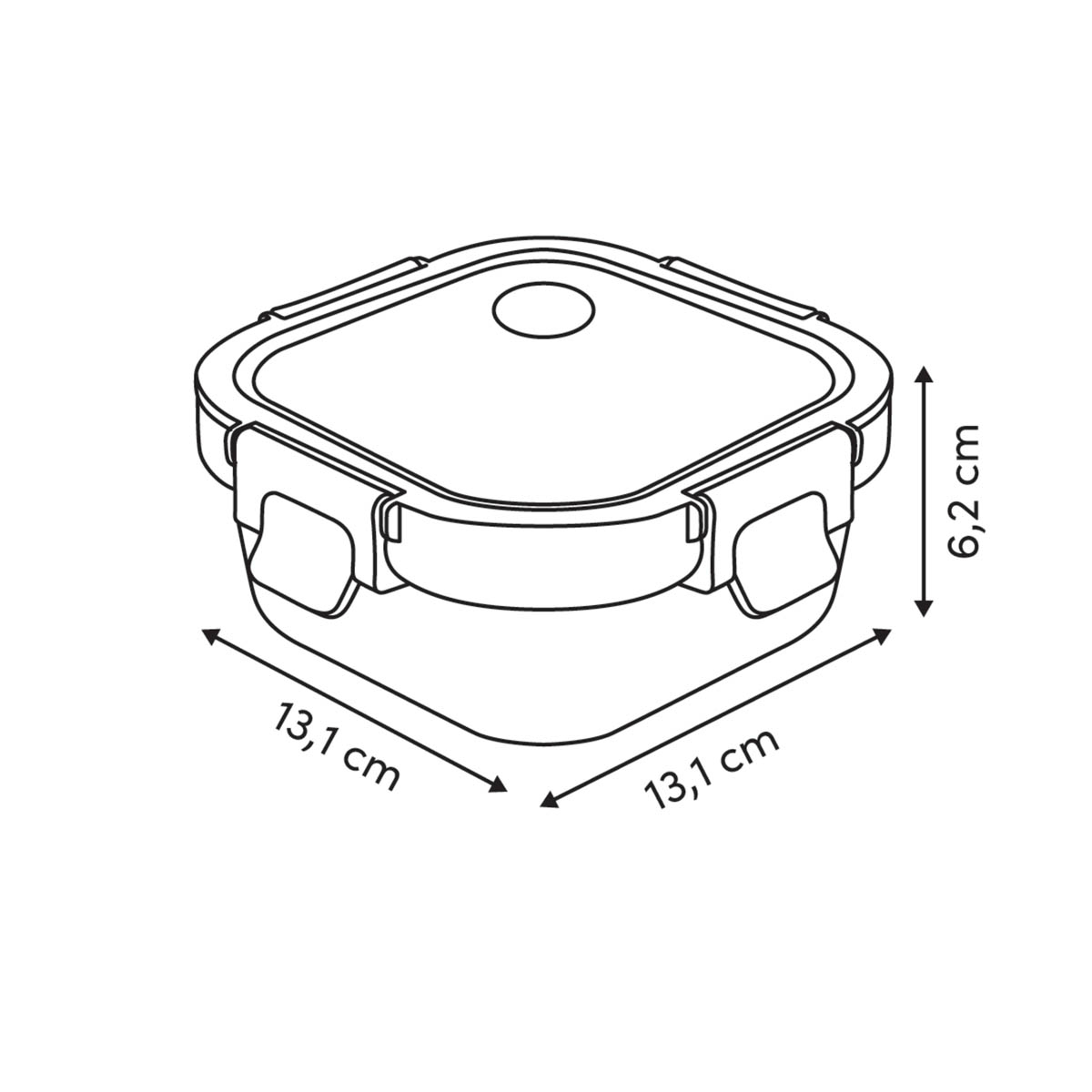 Διάφανο φαγητοδοχείο με βαλβίδα και αεροστεγές κλείσιμο. Είναι κατασκευασμένο από βοροπυριτικό γυαλί, κατάλληλο για επαφή με τρόφιμα, που το καθιστά ιδιαίτερα ανθεκτικό. Διαθέτει καπάκι από πλαστικό και γυαλί σε μαύρο χρώμα, το οποίο κλείνει με 4 κλιπ για μεγαλύτερη ασφάλεια. Η βαλβίδα αποσυμπίεσης του αέρα συμβάλλει στη διατήρηση της ποιότητας και της θερμοκρασίας του φαγητού για αρκετές ώρες. Είναι κατάλληλο για φούρνο μικροκυμάτων, πλυντήριο πιάτων και κατάψυξη. Έχει αντοχή σε θερμοκρασίες από -20 έως 200C. Χωρητικότητα 320ml.